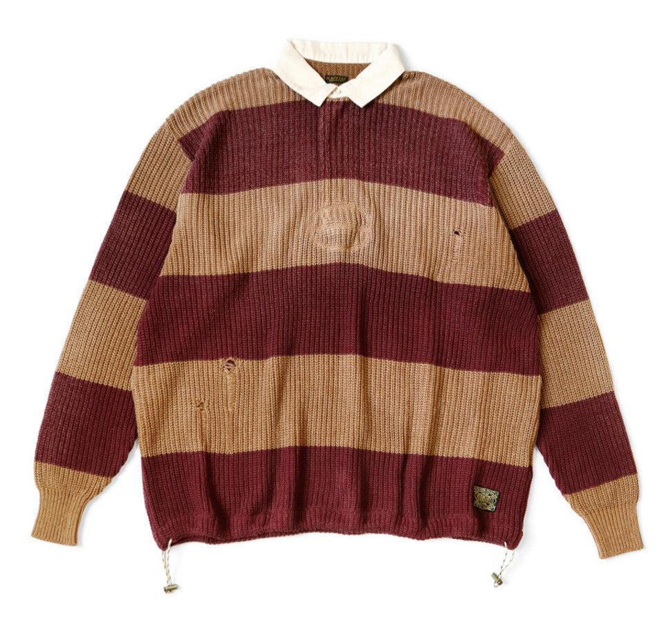 Rugby shirt with thick stripes. The roughly knitted fabric has been given a second-hand finish to recreate the distressed feel of tears and fraying. Fine adjustments to the silhouette are possible with the adjuster at the hem.*This product has been processed as a used item. Any tears or damage caused by processing are intentional in the design and are not product defects. In addition, as this represents changes due to aging, there may be signs of weakness in the fabric etc.*This product is a loosely knitted fabric. Please be careful not to snag or fray when wearing. 70% cotton 30% acrylic Separate fabric 100% cotton Made in Japan K2402KN009