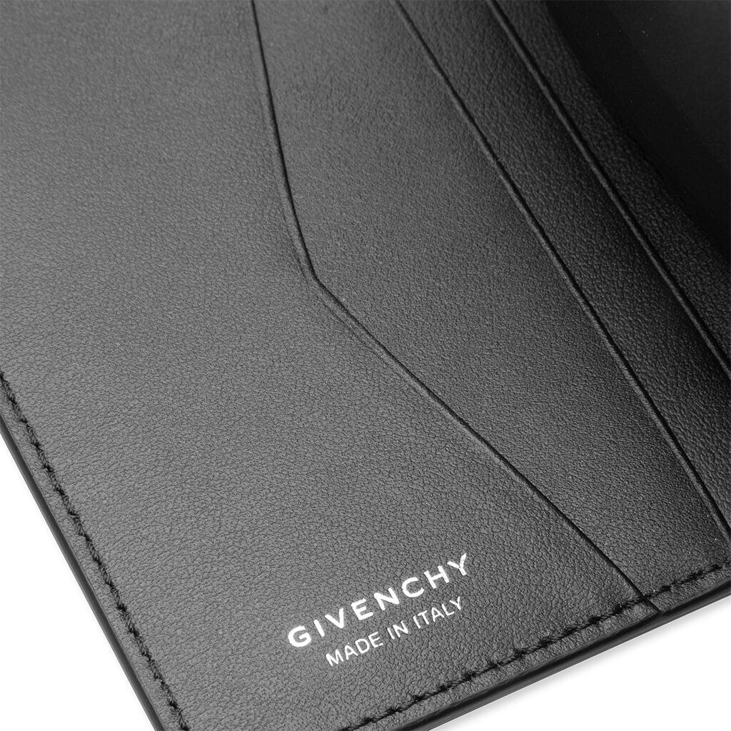 Composed entirely of calfskin leather with a viscose lining, the Givenchy 6CC Card Holder is a must-have accessory. The design features embossed and debossed branding on the inside and outside, while the printed branding on the front spotlights the design even further. The one bill pocket and six card slots provide a functional finish. 100% calfskin leather Viscose lining Embossed branding Debossed branding 1 bill pocket 6 card slots Style No: BK608MK1LQ-001