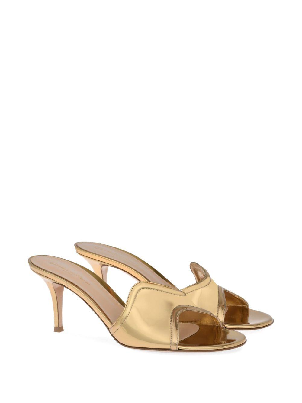 Gianvito Rossi 70mm Lucrezia metallic-effect sandals | Gold | gold-tone | calf leather | laminated finish | metallic effect | open toe | slip-on style | single toe strap | 70mm mid tapered heel | leather sole | Calf Leather/Calf Leather/Calf Leather | Heeled Sandals | Sandals | Shoes | Women