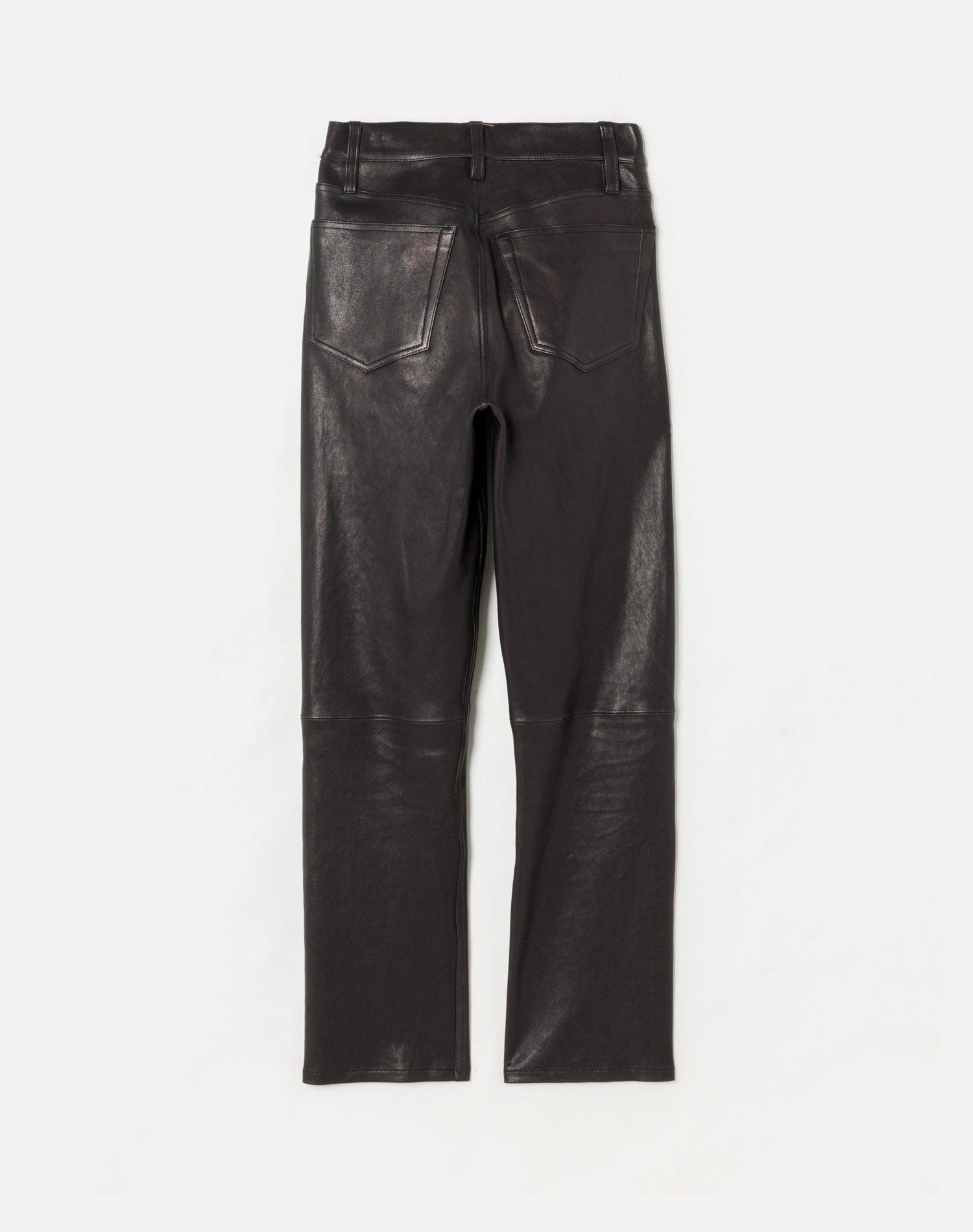 This is a one-of-one product that was made as a sample. It may contain small inconsistencies not usually found in RE/DONE product. All Surplus Sale styles are final sale and cannot be returned. The 70s Straight in Black Leather takes our classic straight leg denim fit and reinvents it in leather. Features classic denim details, zipper fly, and a comfy stretch leather. Fit Intent High rise fit sitting right below the natural waist with full-length inseam. slim-fitted throughout.