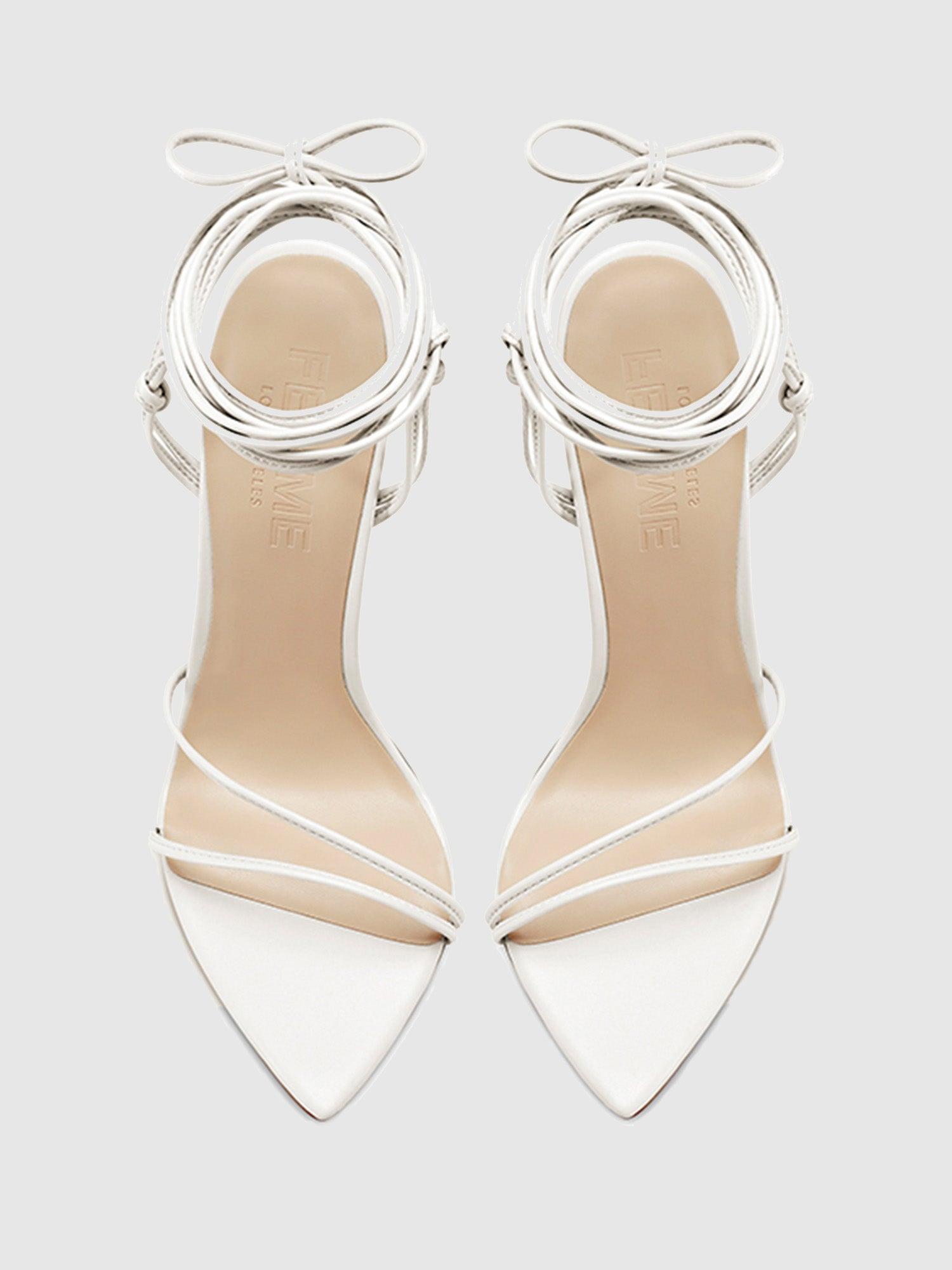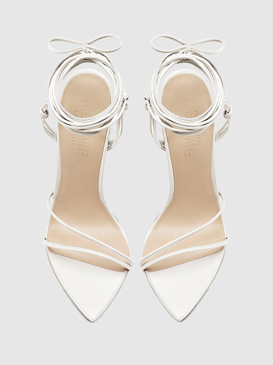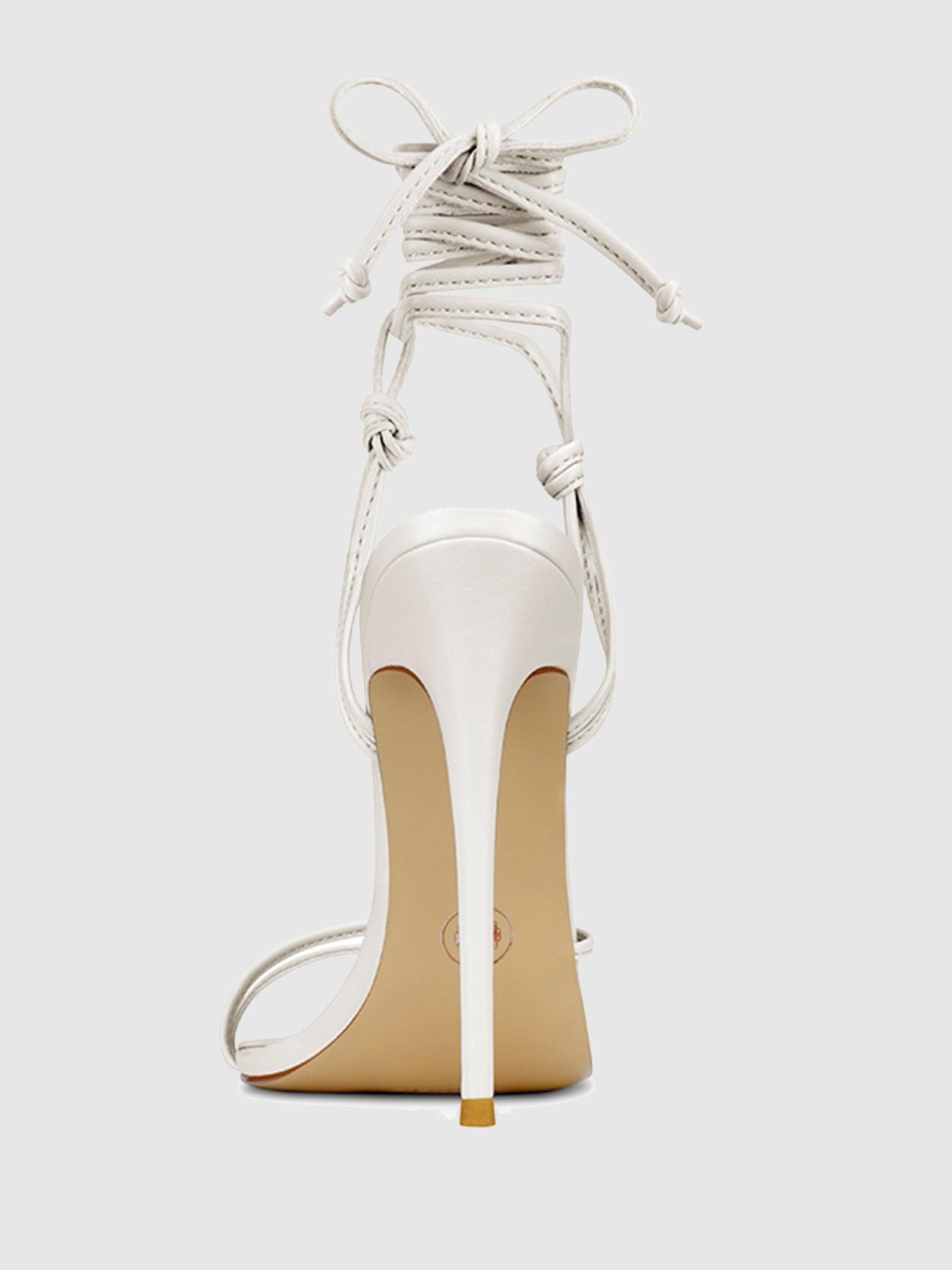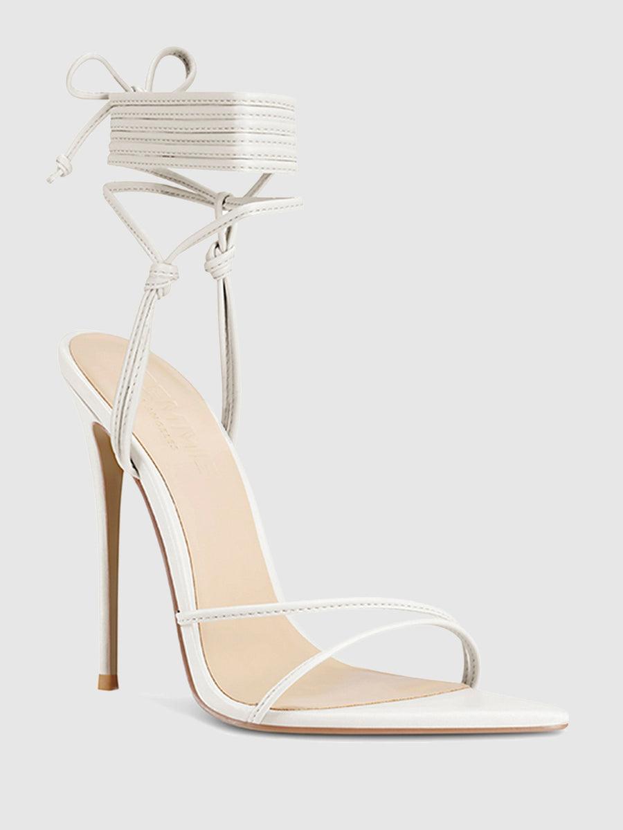 Elevate your shoe collection with the stunning 821 Kika Lace Up Sandal. Crafted from high-quality vegan leather, these sandals boast slender straps that delicately detail the vamp and wrap around the ankle for a sleek and sophisticated look. The pointed toe design adds a touch of elegance, while the striking stiletto heel makes a bold statement. Perfect for any occasion, the 821 Kika Lace Up Sandal is versatile and can be dressed up or down, making it a must-have for any fashion-forward woman. Step out in style and turn heads with these chic and stylish sandals. Vegan upper Vegan Insole Vegan sole Open Pointed Toe Wraparound lace-up Handmade Designed in LA Self-covered stiletto heel, 4.75" (120mm)