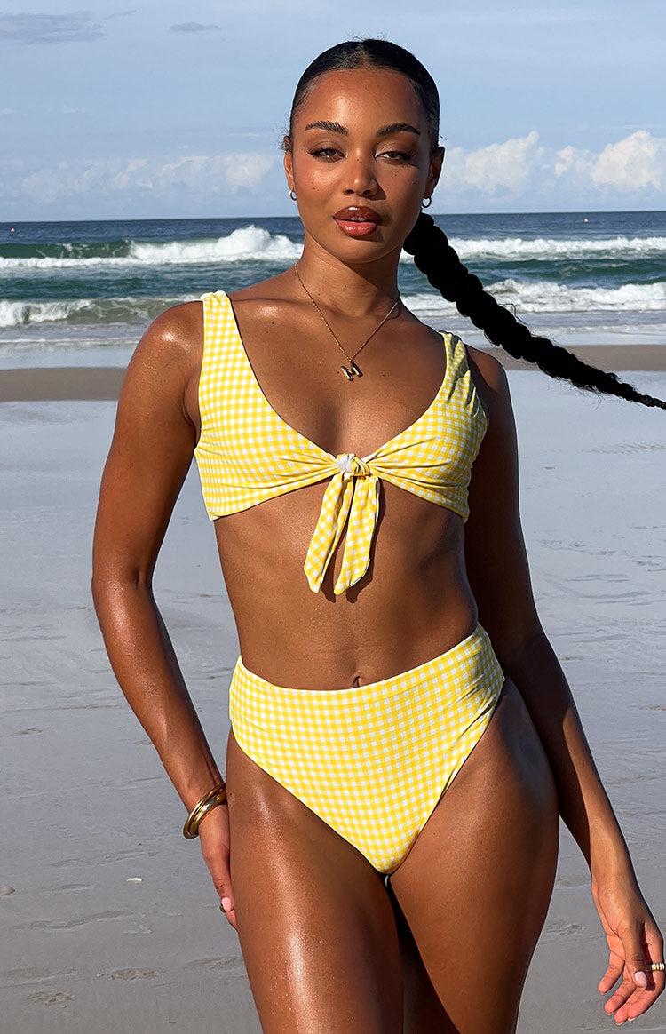Yellow Gingham High waisted Bikini BottomsHow to style:This one is for all of our high waisted bikini bottom girlies. These gorgeous bikini bottoms are sophisticated and pair perfectly with brown sandals, sunglasses and the matching bikini topFeatures: Fully lined High waisted style Lightweight material Stretch fabric Pull on style Slightly cheeky coverage Print may differ Made from recycled materials