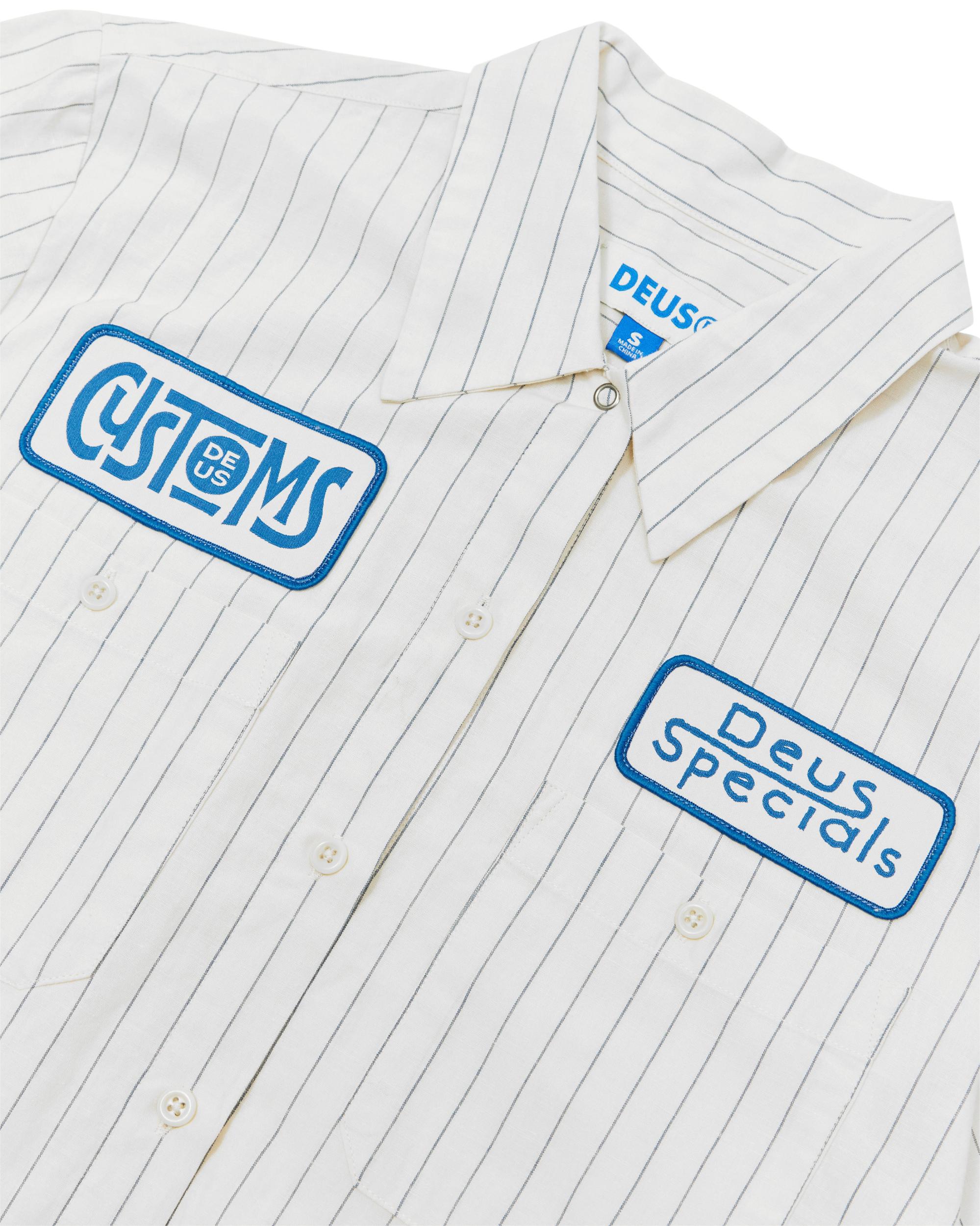 Oversized Short Sleeve Work Shirt, Embroidered Art Patches At Chest, Centre Front Corozo Nut Button Closure, Chest Patch Pockets, In A Polyester Cotton Mix Fabrication With A Heavy Garment Wash