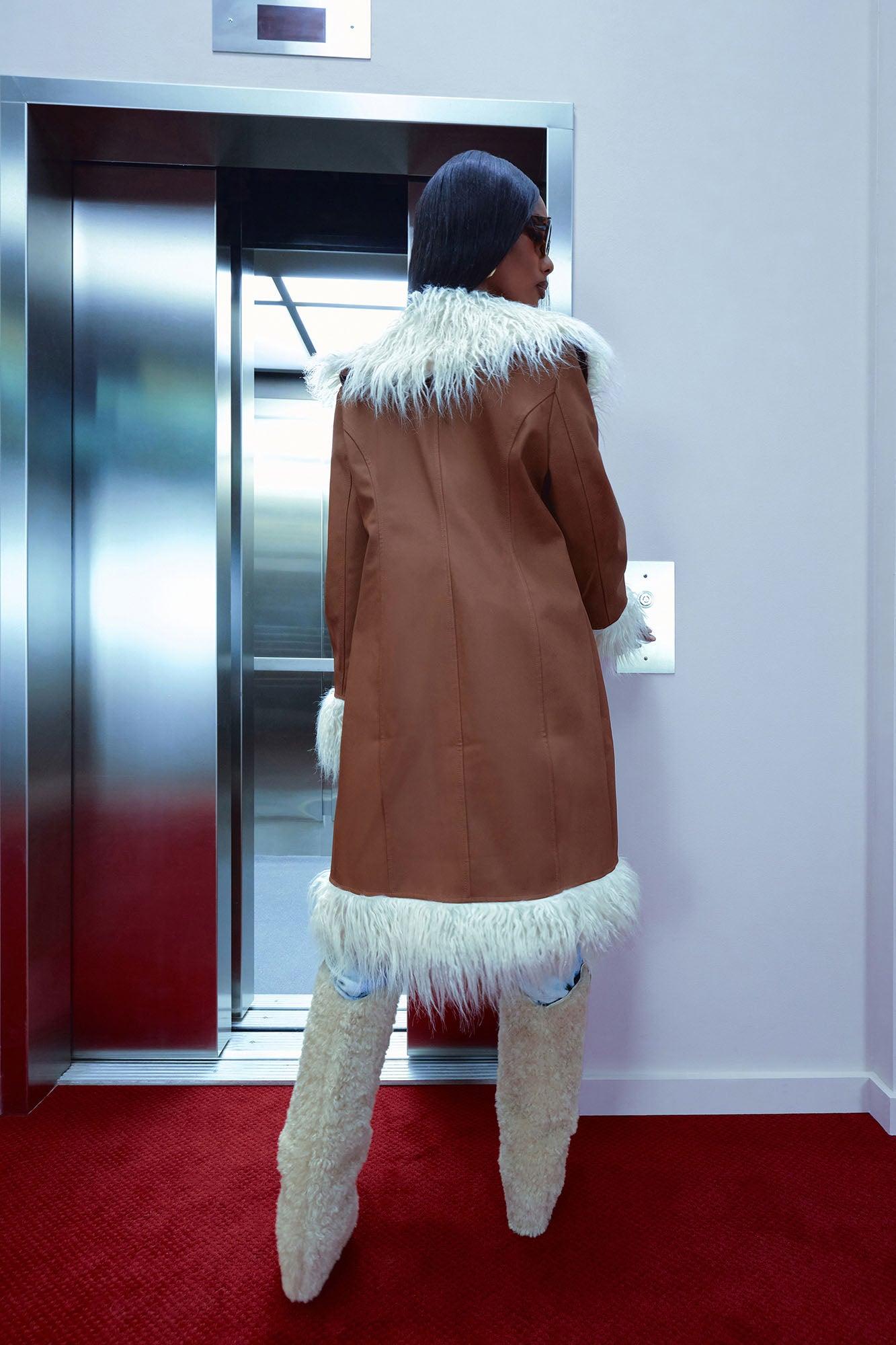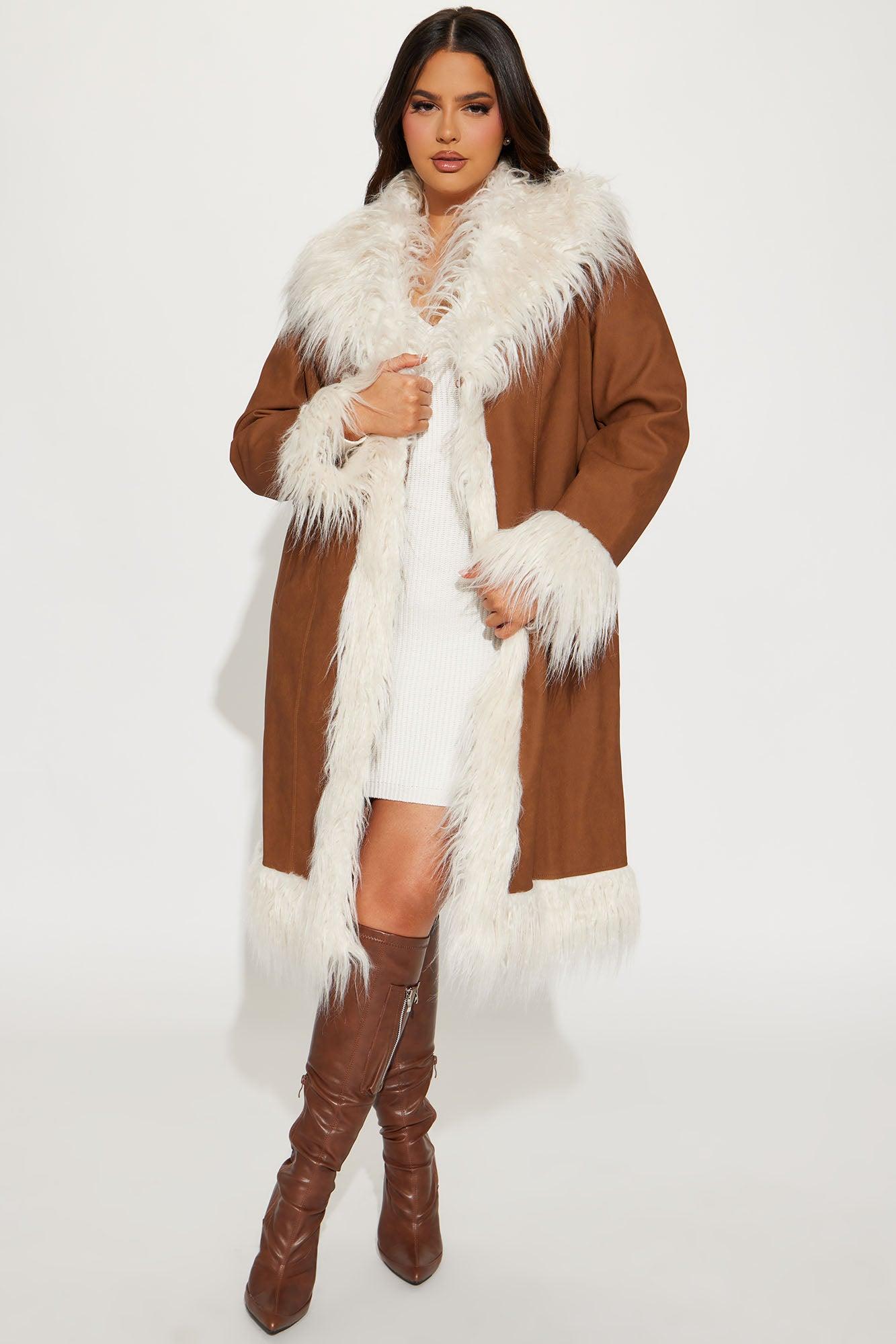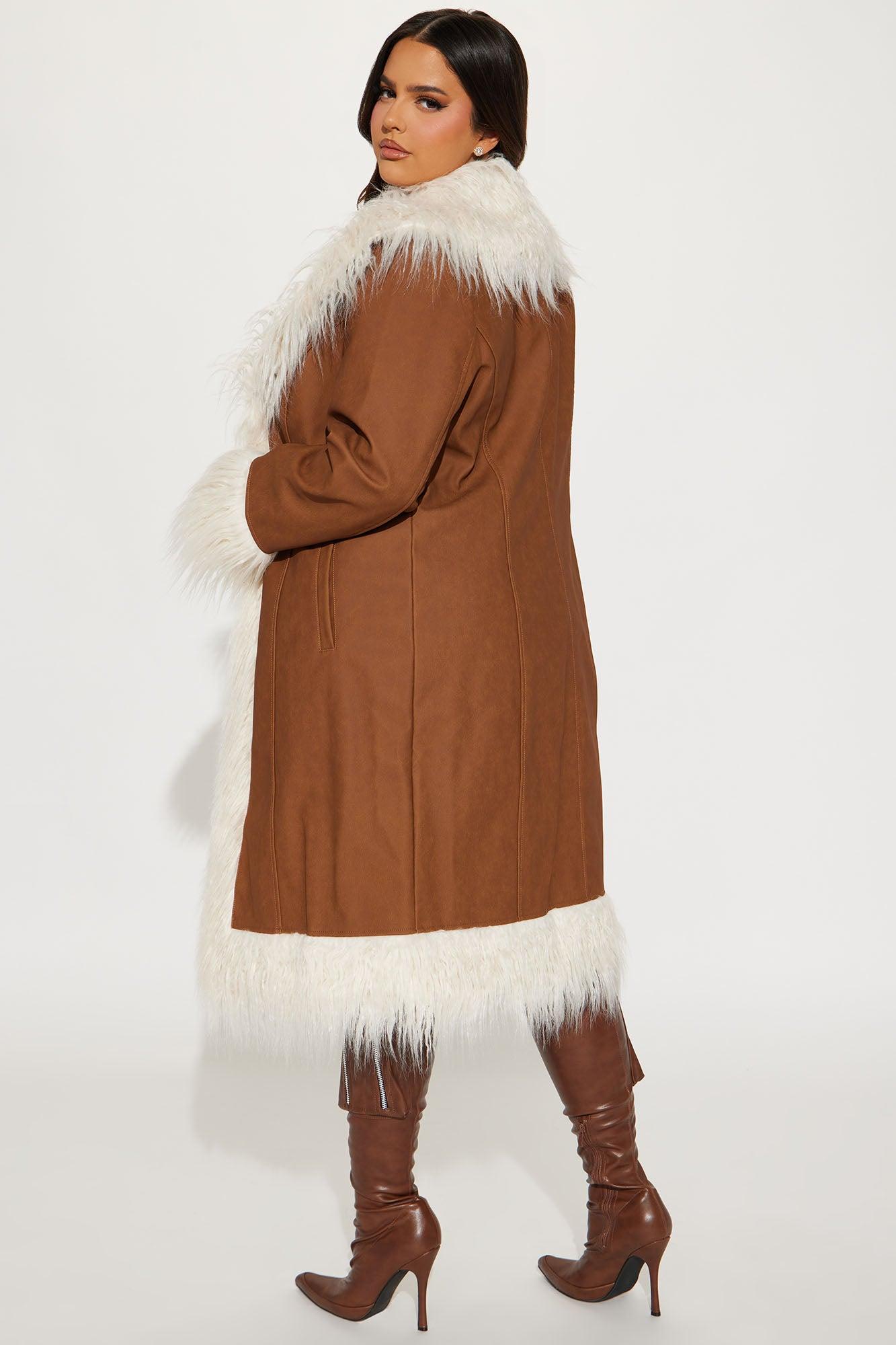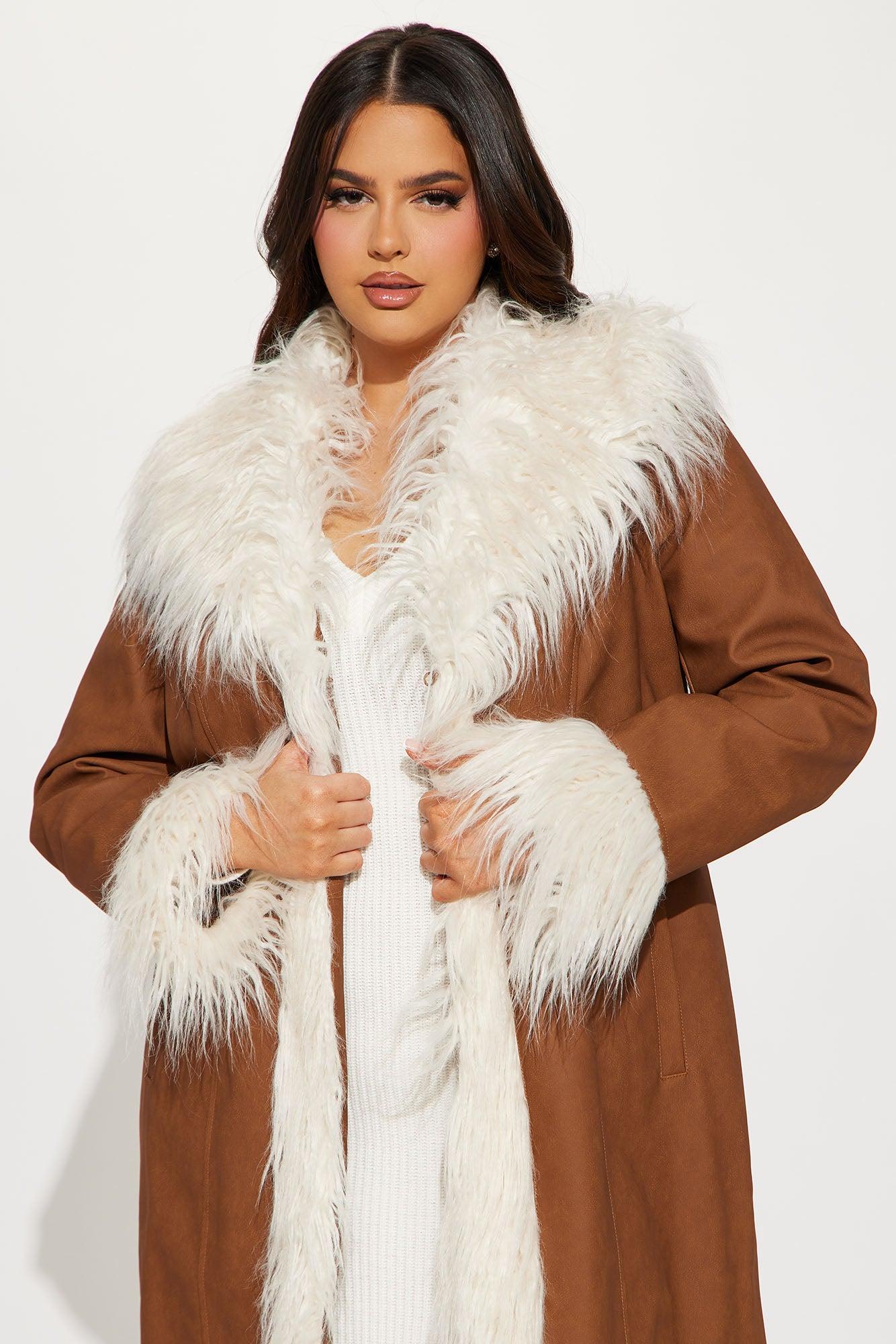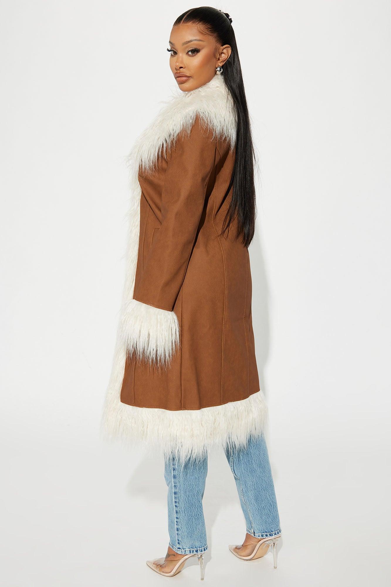 Available In Cognac. Faux Leather Coat Fur Trim Pocket Open Front Dry Clean Only Shell Facing: 100% Polyurethane Faux Fur: 70% Acrylic 30% Polyester Backing/Lining: 100% Polyester Imported California Proposition 65WARNING: Cancer and Reproductive Harm - www.P65Warnings.ca.gov.