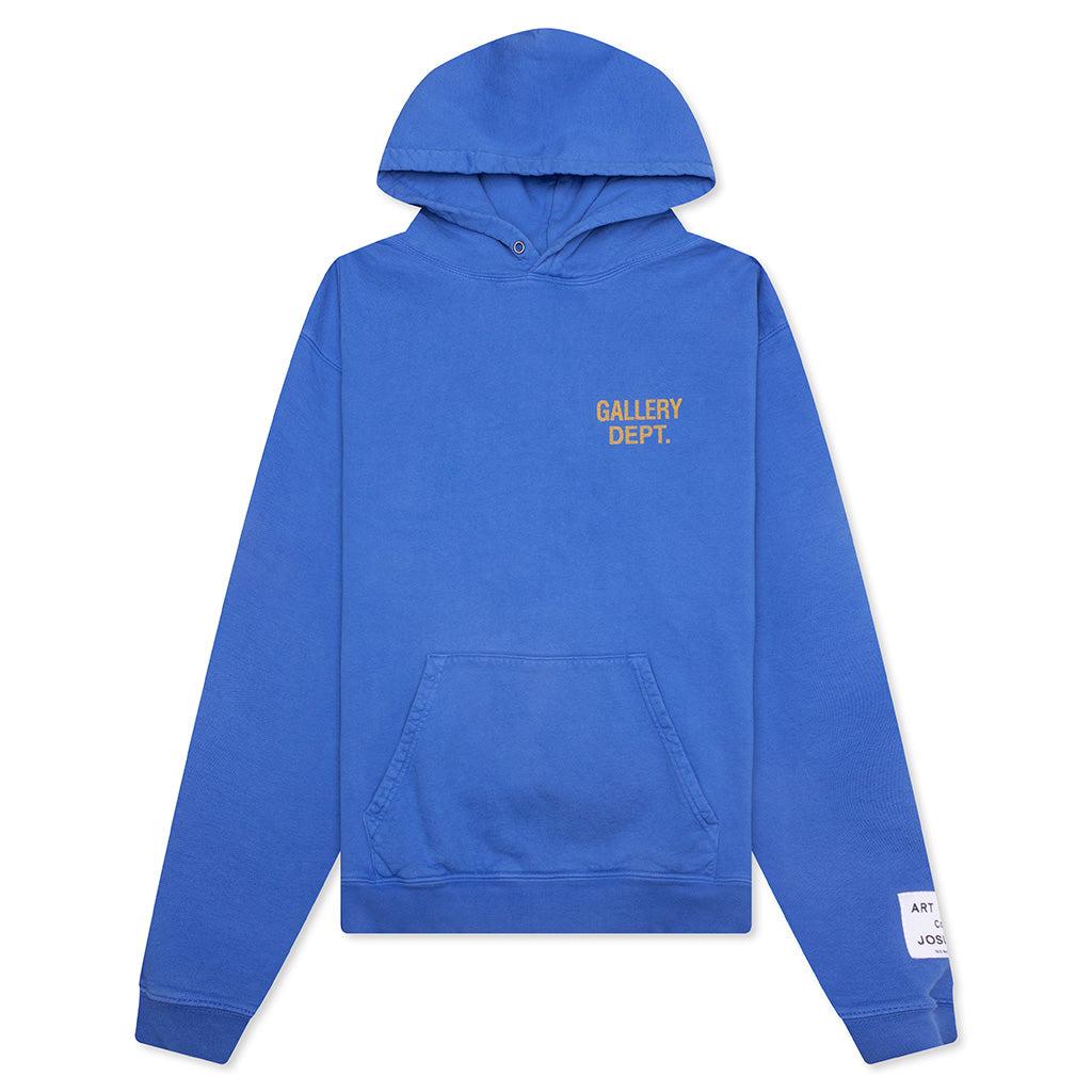 Gallery Dept. The 90's GD Logo Hoodie delivers a bold take on everyday wear. Crafted from 100% loopback cotton-jersey, it offers a soft feel with a durable structure. The oversized fit creates a relaxed silhouette, while the GD ENGLISH logo is printed on the front and back for a signature look. A classic front pocket adds function, and the brand’s 'art on display' patch at the cuff completes the design. Made in the USA. 100% Cotton Oversized fit GD English logotype Kangaroo pocket Attached hood Applique patch Ribbed trims Style No: GDLH-50025-ROYL GDLH 50025 ROYA