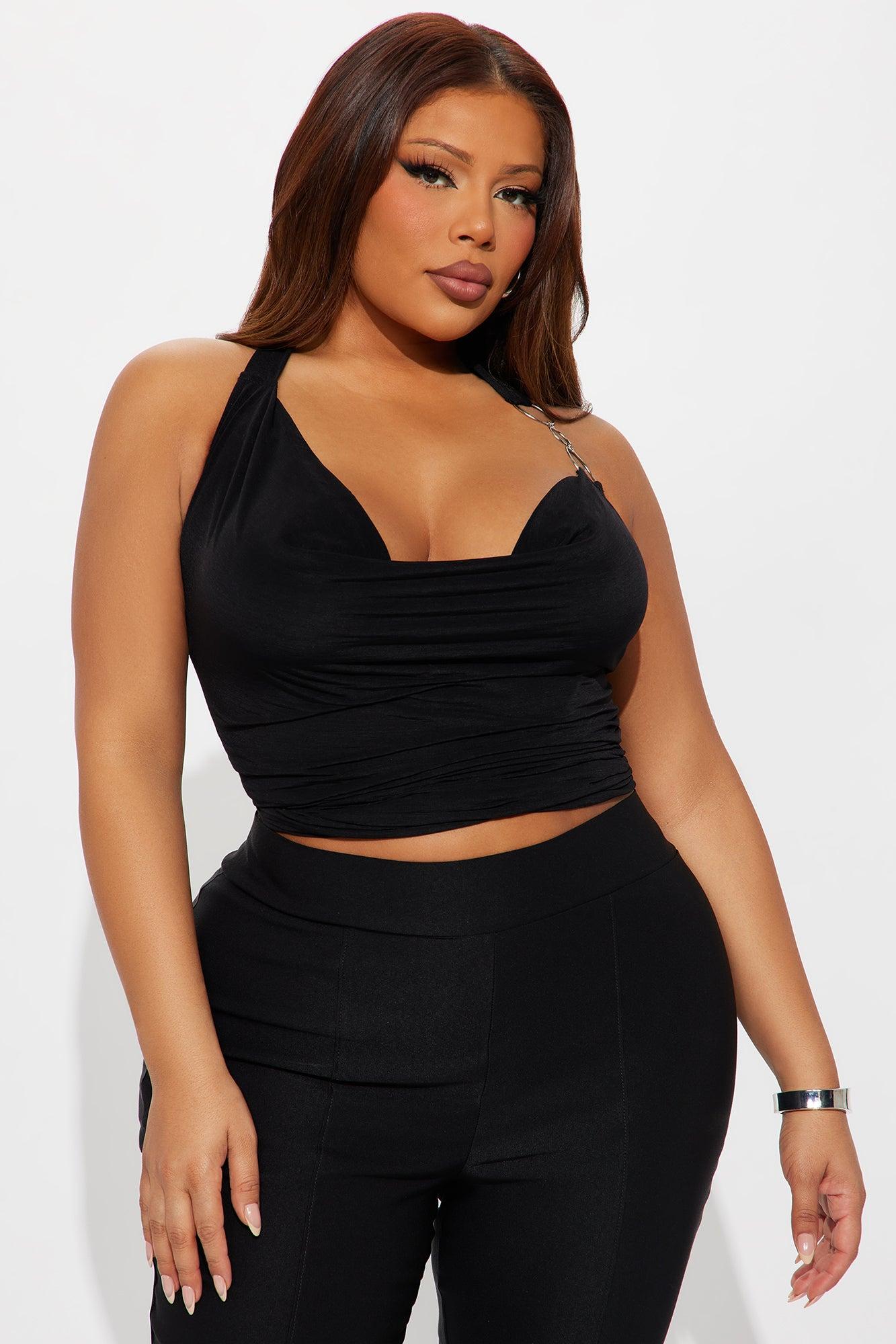 Available In Black And Burgundy. Halter Top Stretch Hardware Detail Cowl Neck Self: 100% Polyester Lining: 95% Nylon 5% Spandex Imported California Proposition 65WARNING: Cancer and Reproductive Harm - www.P65Warnings.ca.gov.