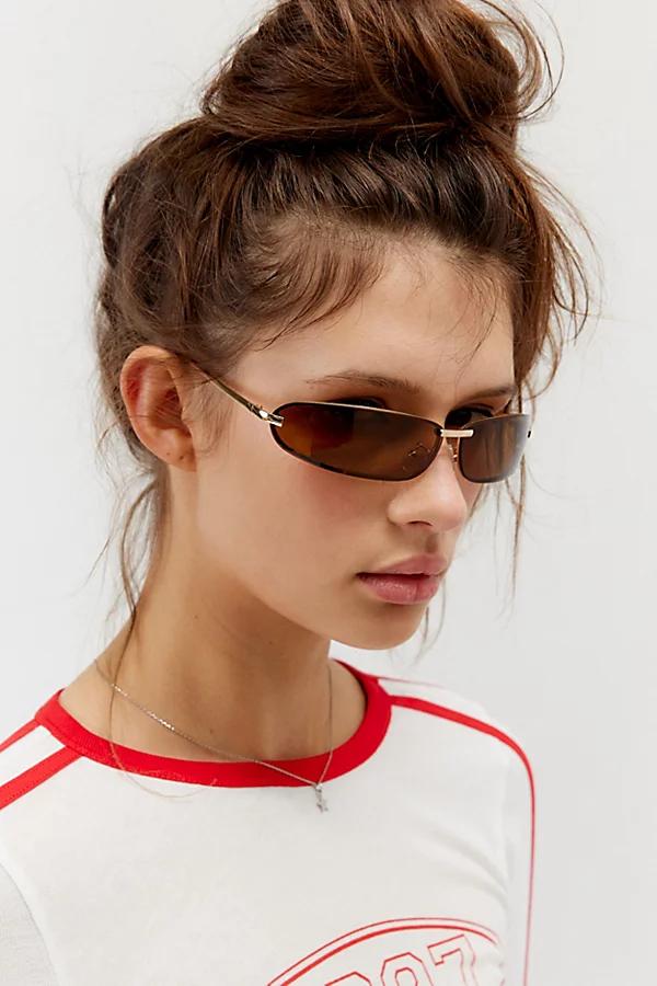 Lightweight curved rimless shield sunglasses that are such a 90s vibe. Features 90s curved rimless shield sunglasses Low-profile shield sunglasses Vintage sunglasses look Rimless design with wide oval lenses Ultra-comfy & lightweight 100% UV protection Content + Care Mixed metal, plastic Wipe clean Imported 90s Curved Rimless Shield Sunglasses in Black Smoke, Womens at Urban Outfitters