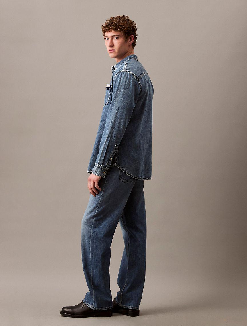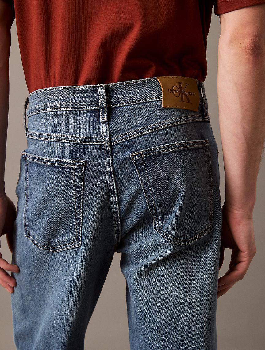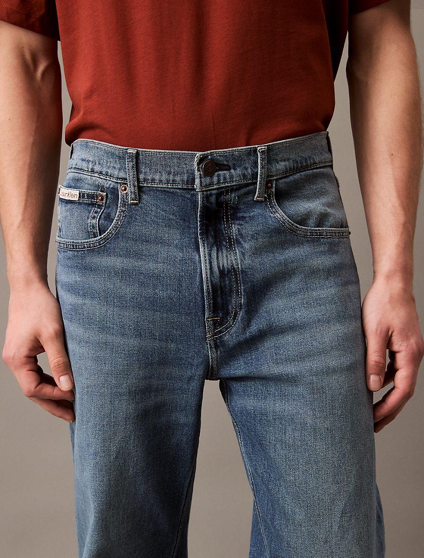 A relaxed straight leg silhouette, these jeans reimagines 90s styling in an updated fit. Cut with a mid rise waist and crafted with stretch for effortless wear. Made with a zip fly and a top button closure. Finished with a CK monogram logo patch at the back waist.