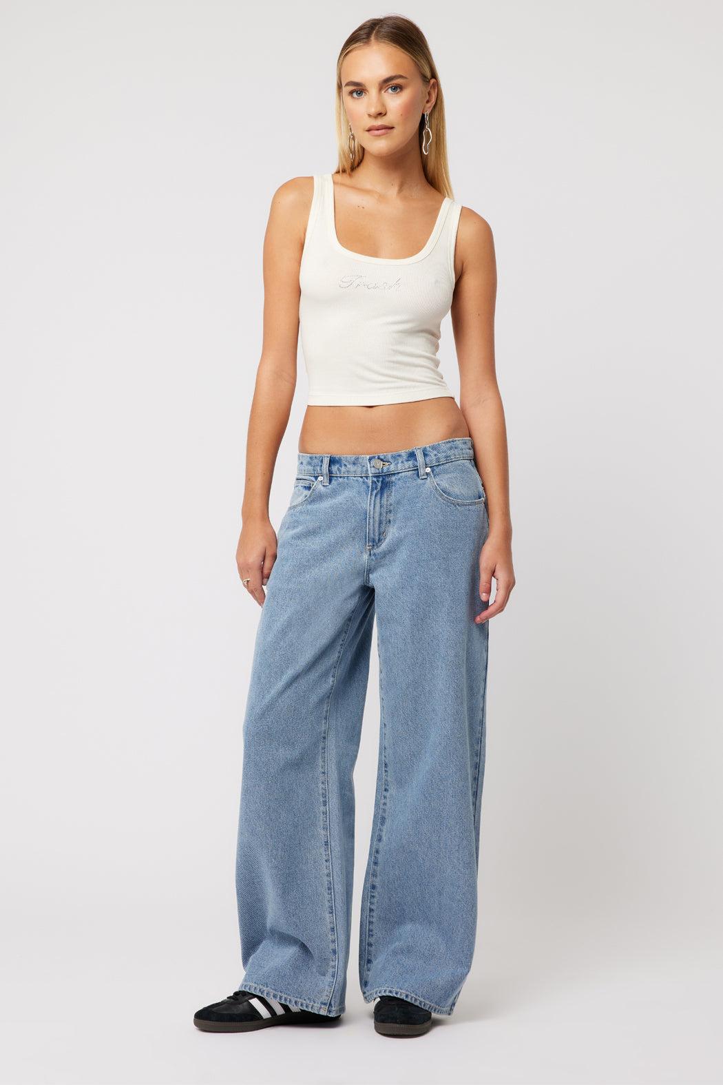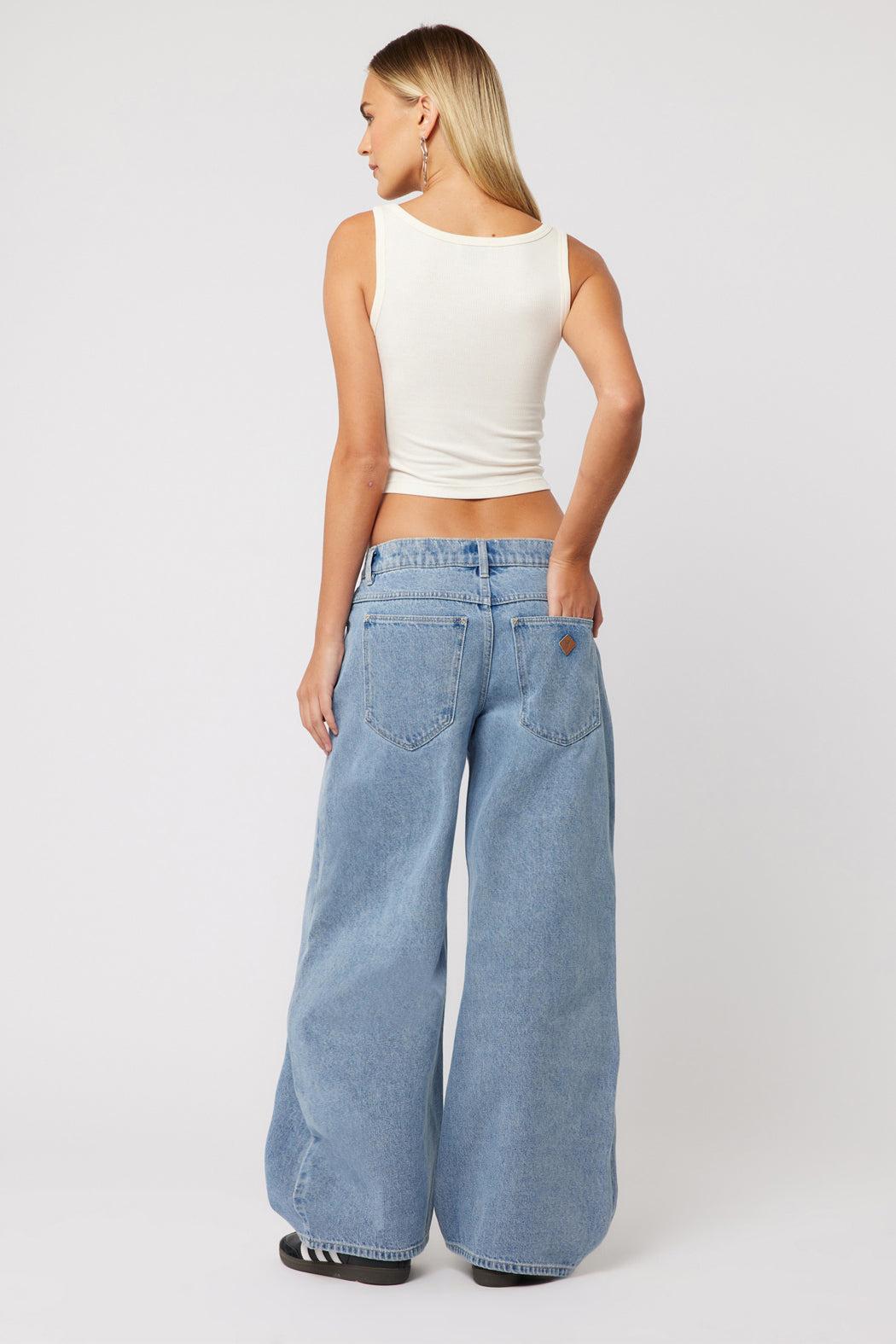 The ultimate cool girl jeans, the 99 Mega Baggy is made from a rigid 100% cotton denim and sits low hips with an ultra wide leg that is meant to break at the shoe. This light wash is perfect for summer and the rigid denim will only get softer with wear.
