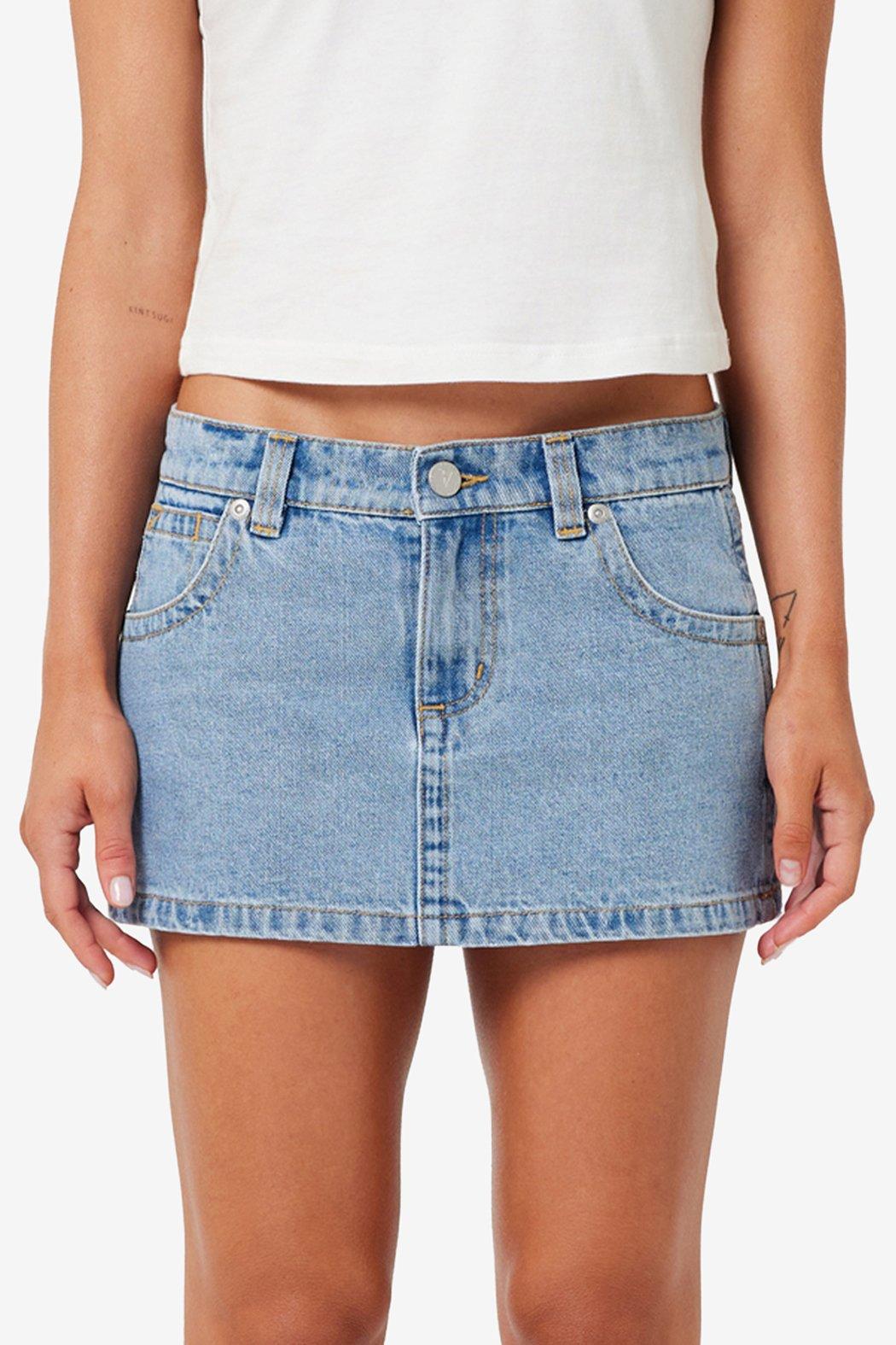 From the A Brand X Rip Curl collab comes the denim micro mini skirt of the summer. In a classic light wash rigid denim, this low slung mini skirt features a bold Rip Curl patch on the back and the classic A Brand logo in a neon yellow on the back pocket.
