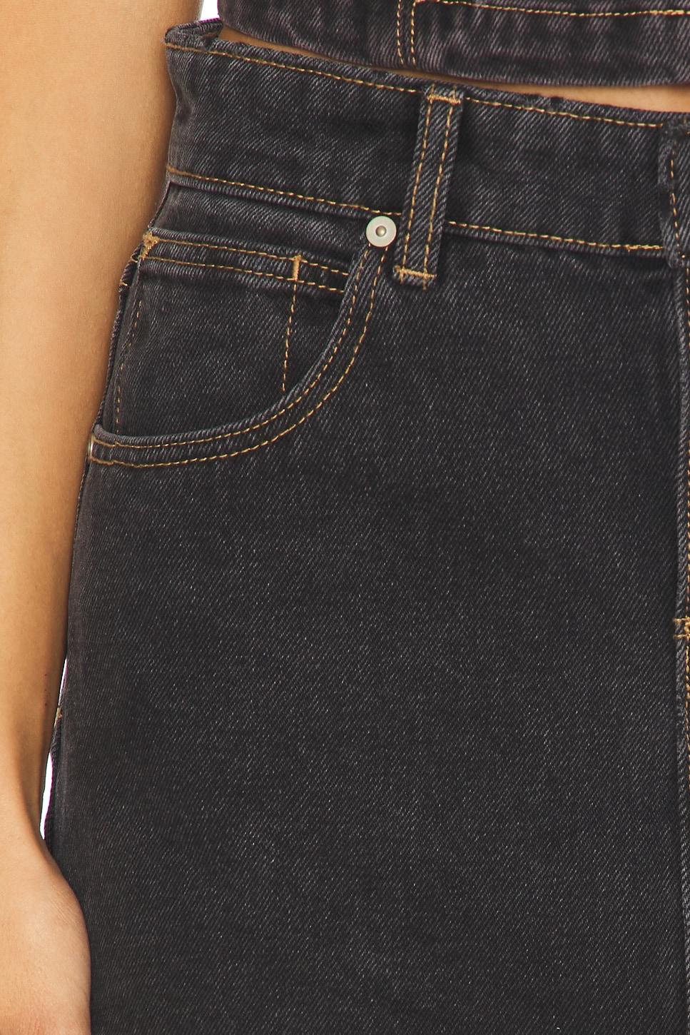 69% cotton, 19% polyester, 12% viscose. Machine wash. Unlined. Zip fly with button closure. 5-pocket styling. Logo detail at back. Structured denim fabric. Skirt measures approx 11.5" in length. Made in China. Revolve Style No. ABRR-WQ28. Manufacturer Style No. A44K29.