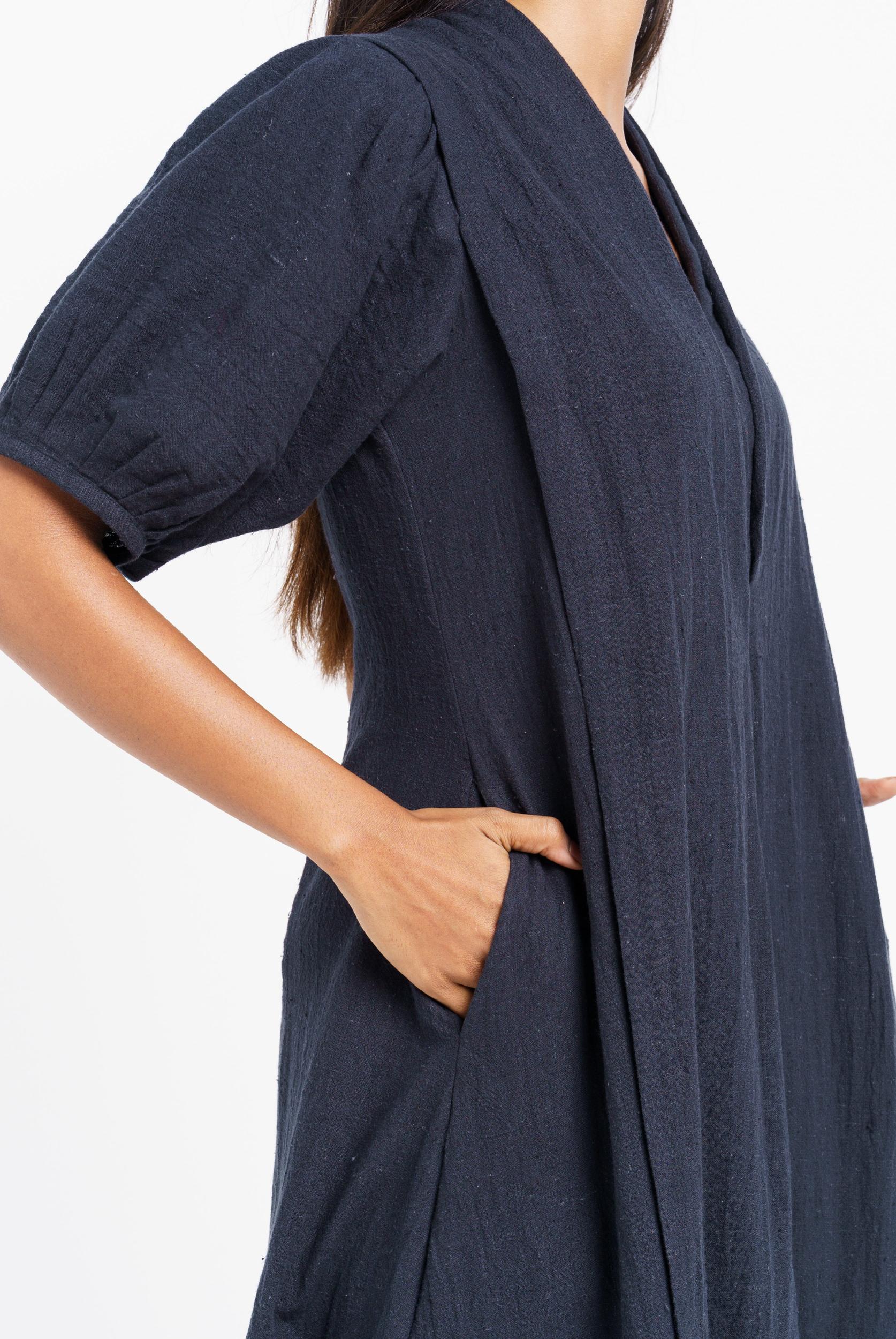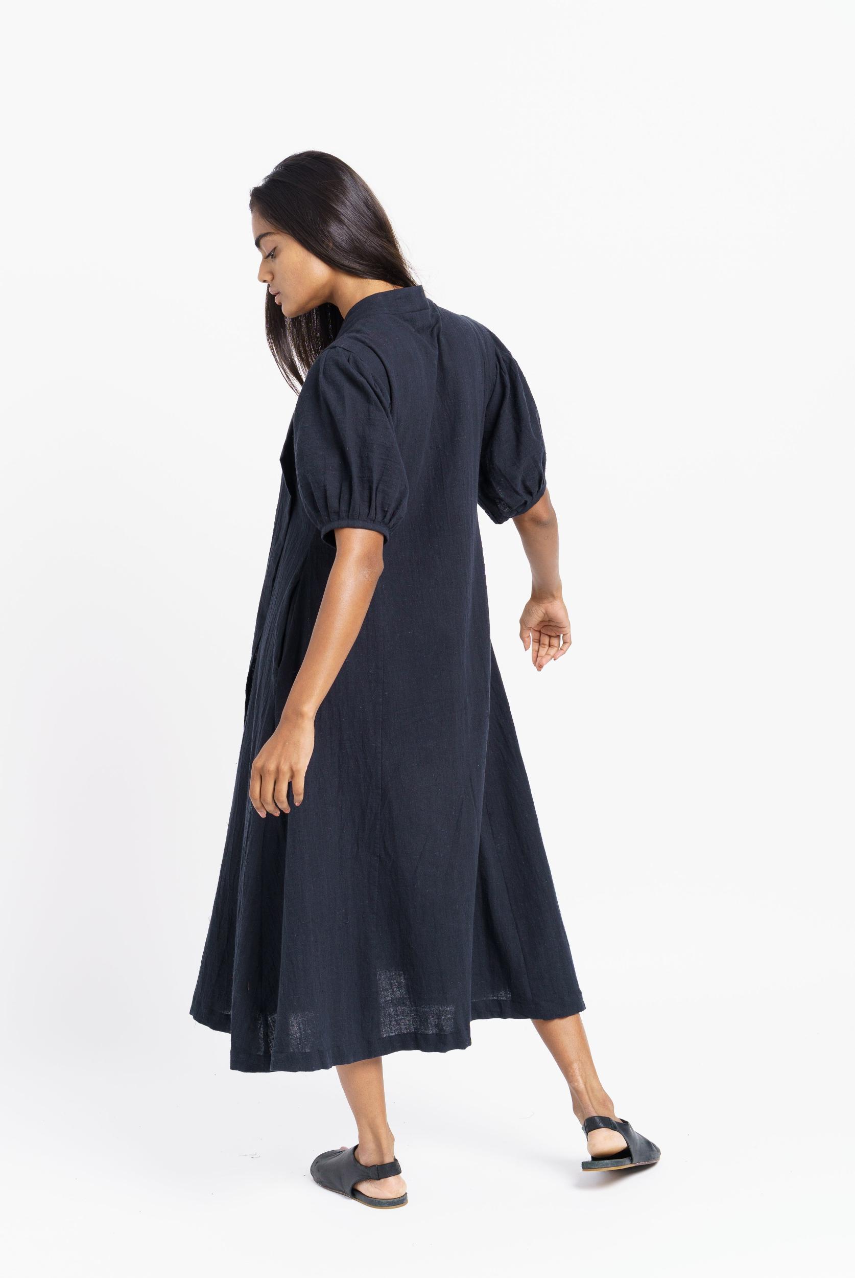 A classic ink black dress cut from planet-friendly organic and natural cotton fabric. Generously flared silhouette for everyday comfort, detailed with puffed sleeves to beautify the shoulder lines and freedom in movement. A striking piece for your desk to dinner plans.