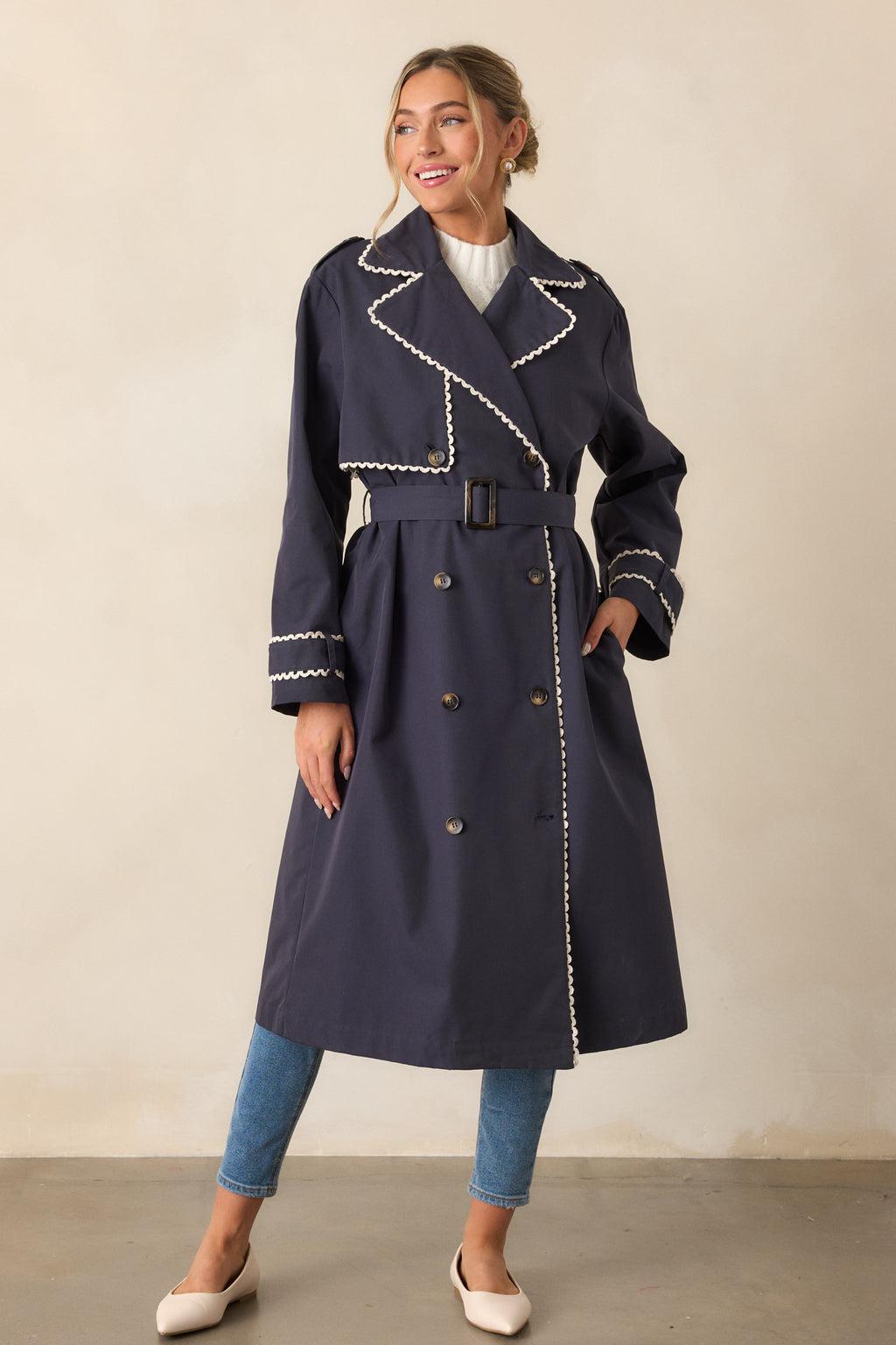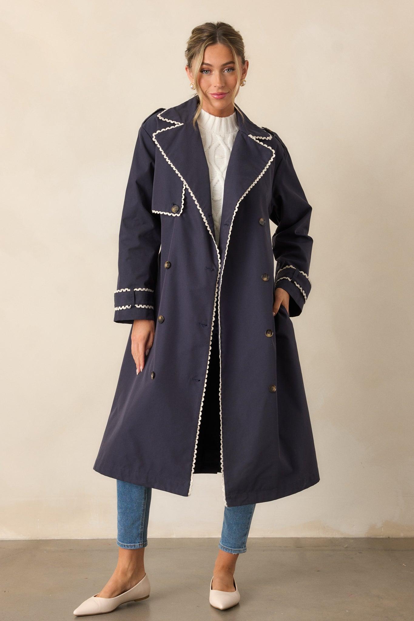 Stay chic and stylish in any weather with our Crazy Idea Navy RicRac Trench Coat. Made with a durable fabric, this coat features unique ricrac detailing that adds a touch of personality to any outfit. Perfect for any occasion, this trench coat is a must-have for your wardrobe. This navy trench coat features a notched lapel collar neckline, a double breasted functional button front, an optional self-tie belt, ivory ricrac trim throughout, and long sleeves with button cuffs.