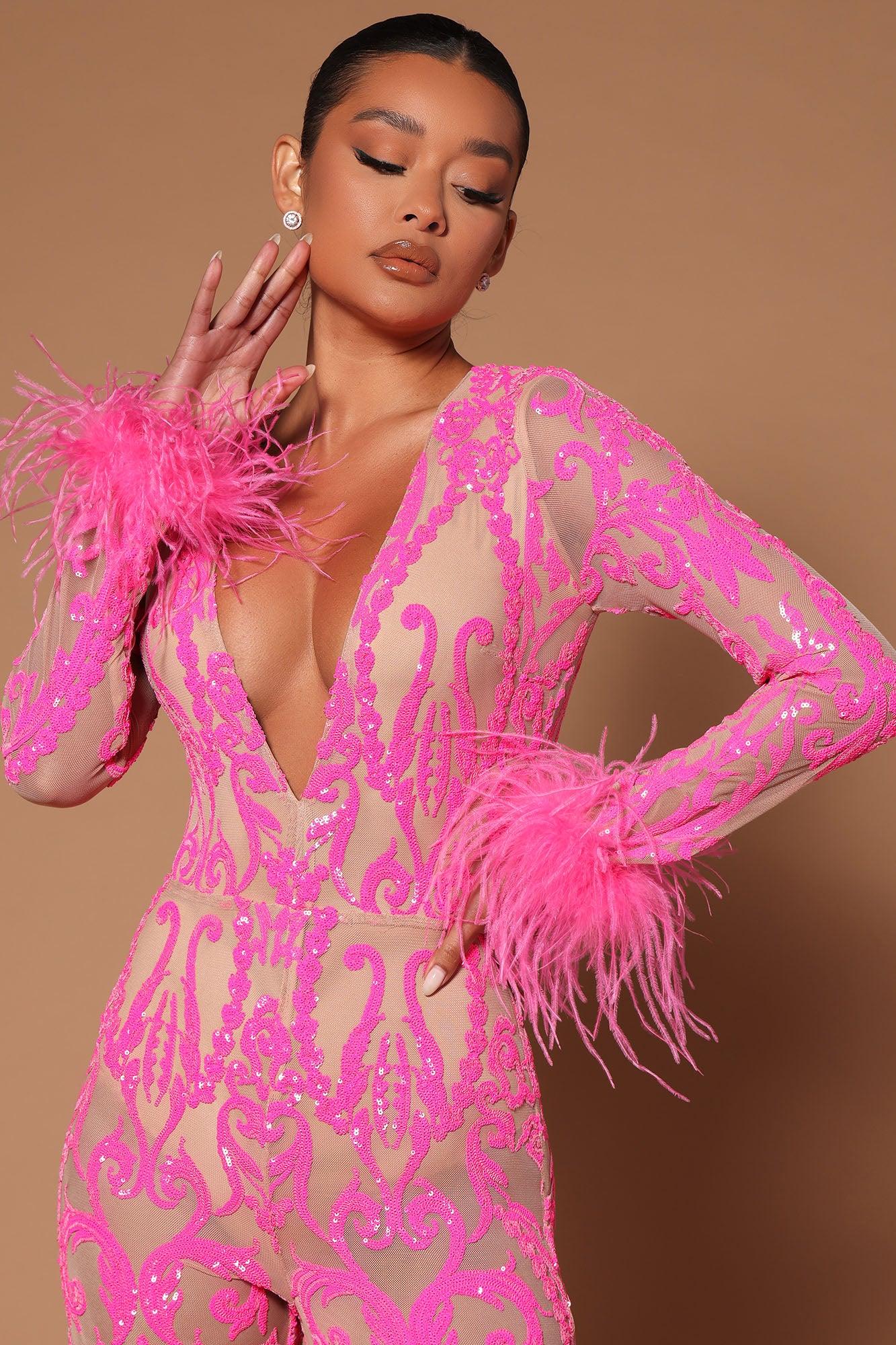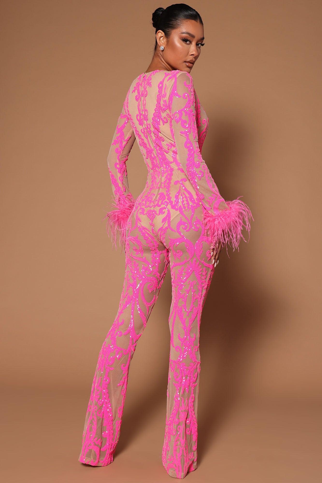 Available In Pink. Sequin Jumpsuit Long Sleeve V Neck Feather Trim Flare Leg Bodysuit Lining Invisible Back Zipper Stretch Disclaimer: Pattern Placement May Vary Self: 95% Polyester 5% Spandex Contrast/Lining: 100% Polyester Imported California Proposition 65WARNING: Cancer and Reproductive Harm - www.P65Warnings.ca.gov.