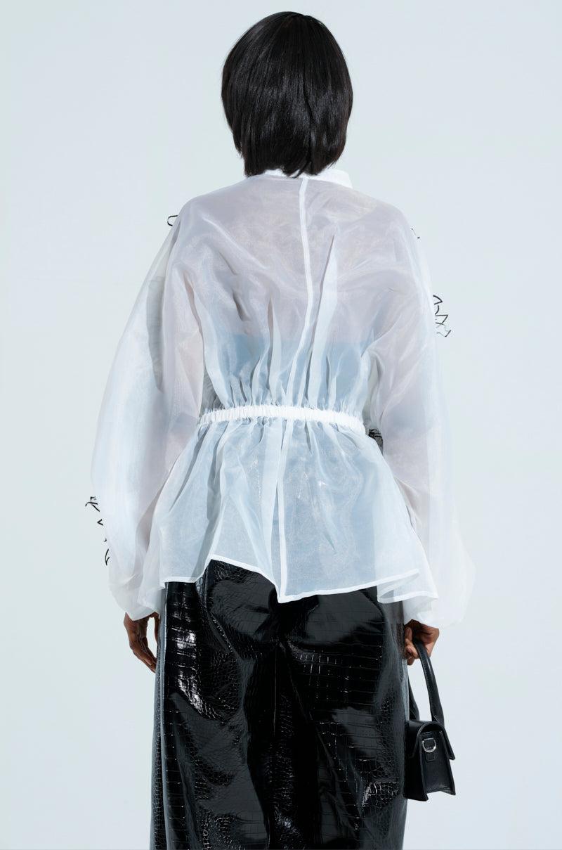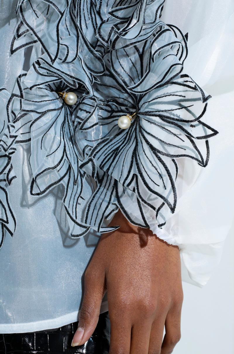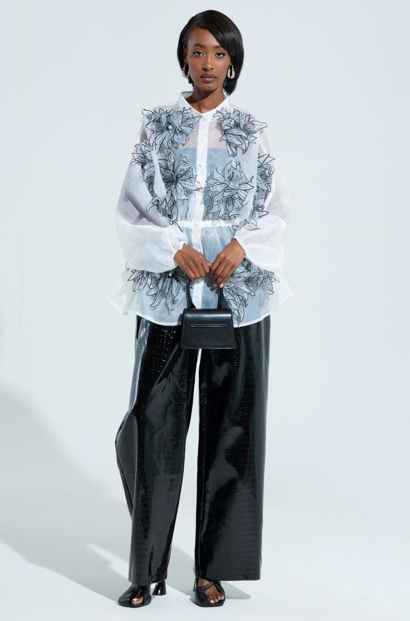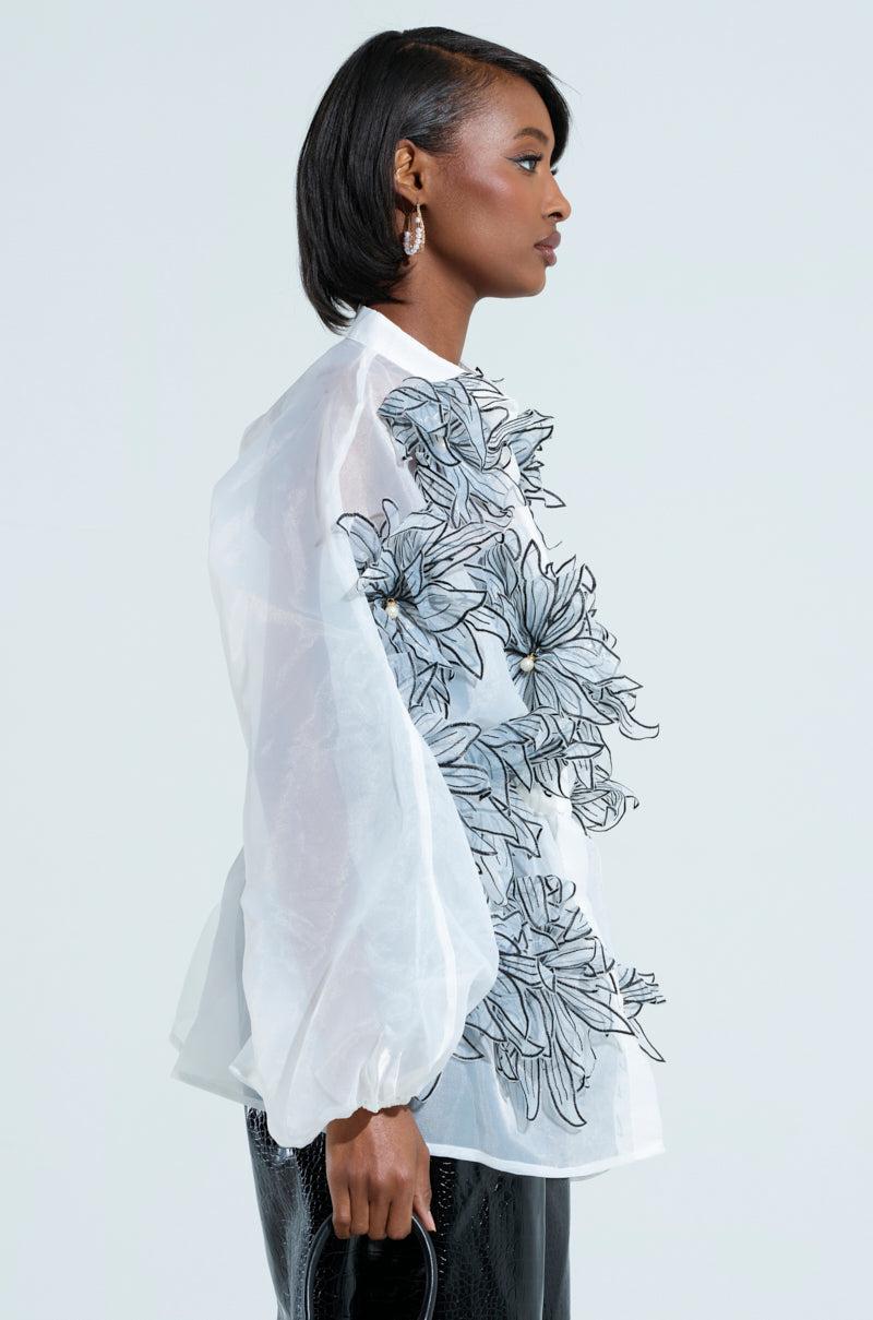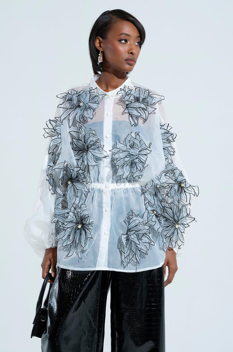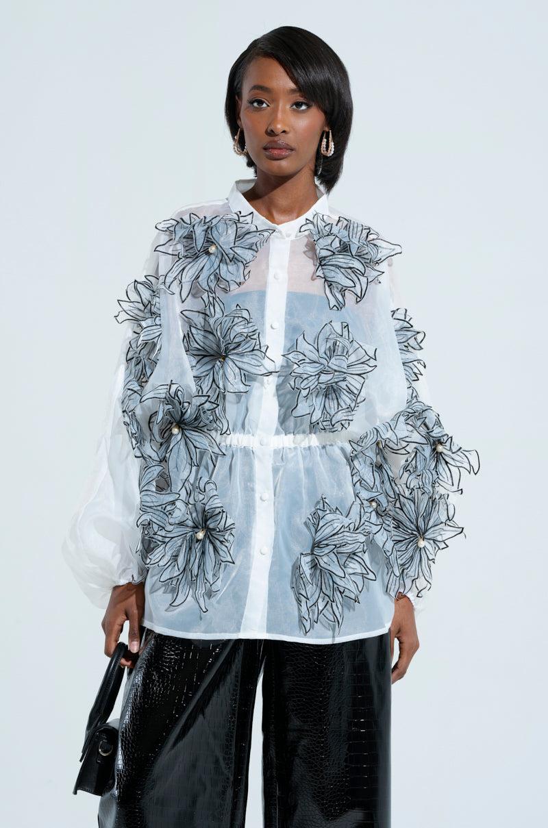 This is your sign to buy The AKIRA Label A Gentle Reminder Flower Applique Blouse. This stunning top is crafted from a sheer, gauzy fabrication and features stunning 3D flower appliques with pearl embellished centers scattered throughout, a mock collar, long blouson sleeves with cinched cuffs, an elasticized waistband that delivers a peplum look, and tonal button down front closures. Complete with a longline silhouette. Pair with satin trousers, stilettos, and a red lip for a finished look. - Shell: 100% Polyester- No Stretch- Imported (all measurements approximate from size S/M)- 28” Shoulder to Hem- 22” Sleeves- 20” Shoulder to Shoulder- Model is 5’8” and is wearing size small Product ID: 470557