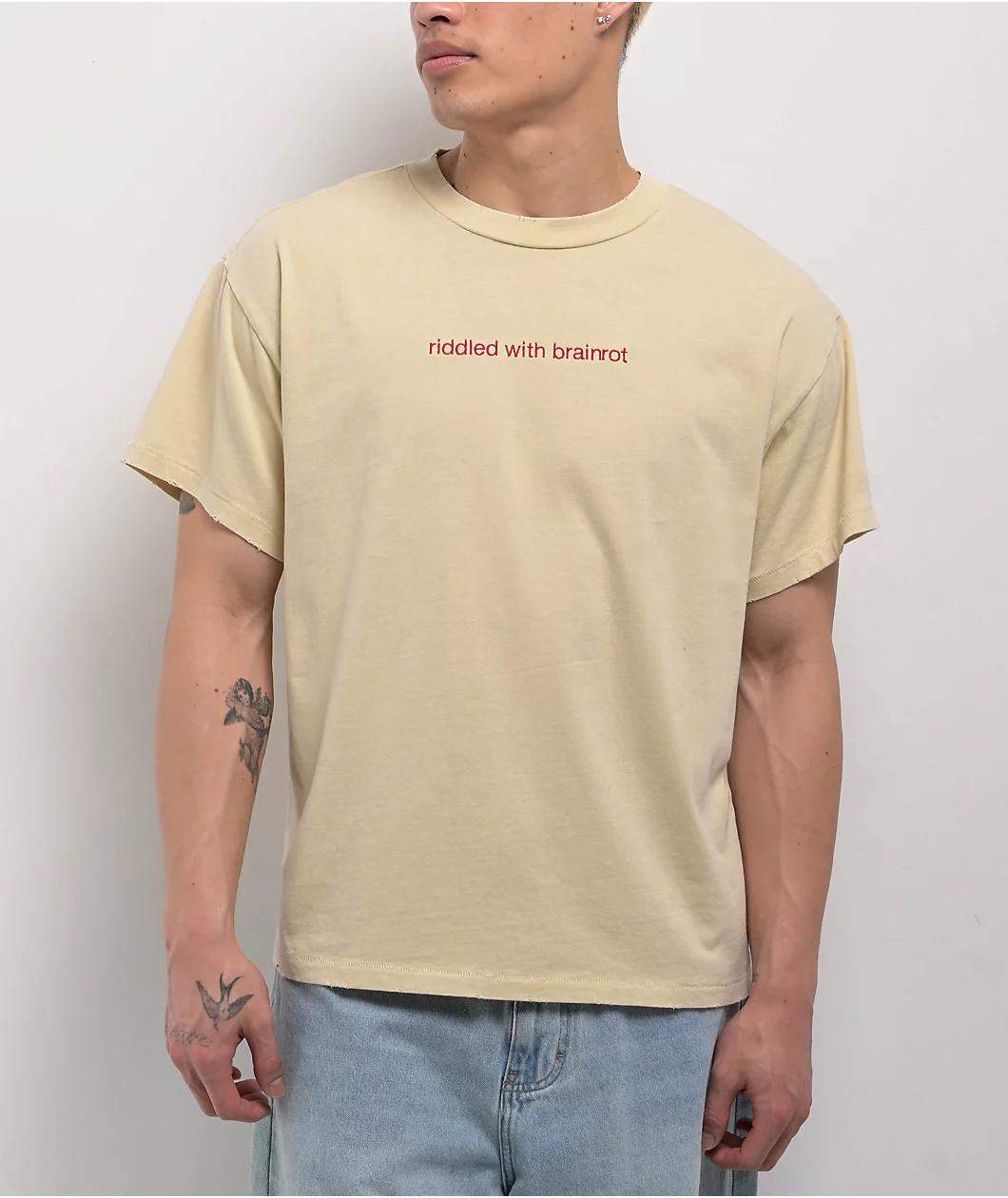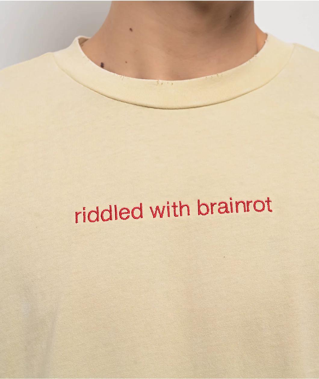 A.LAB delivers the Brainrot t-shirt in a natural beige cotton build with embroidered text on the front and subtle distress frays on the hems. Ideal for a self-aware amateur comedian, the lowercase phrase on the chest reads "riddled with Brainrot" as