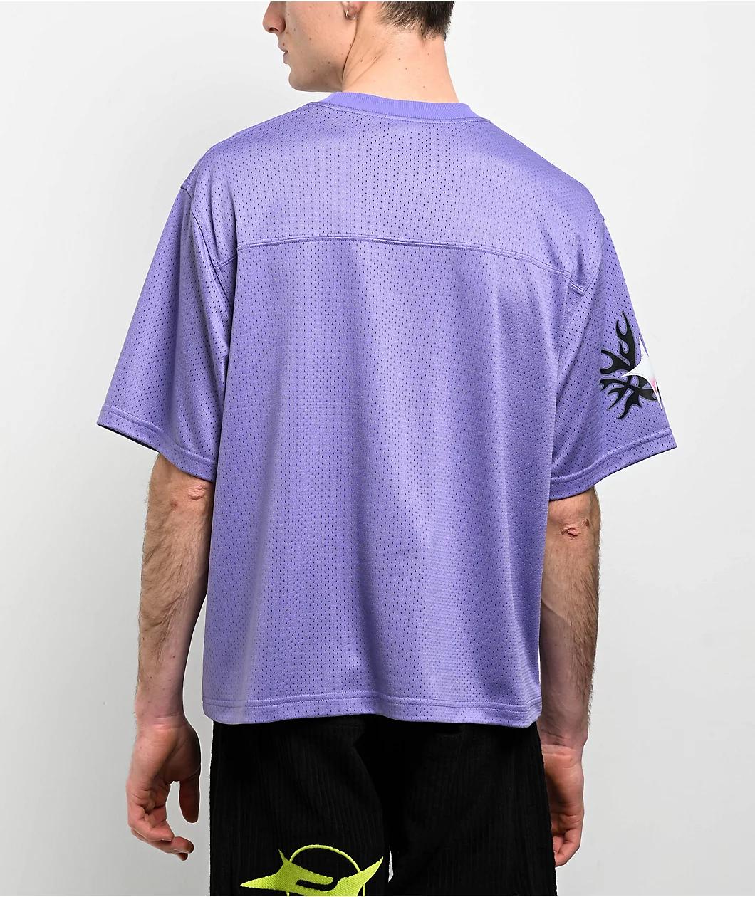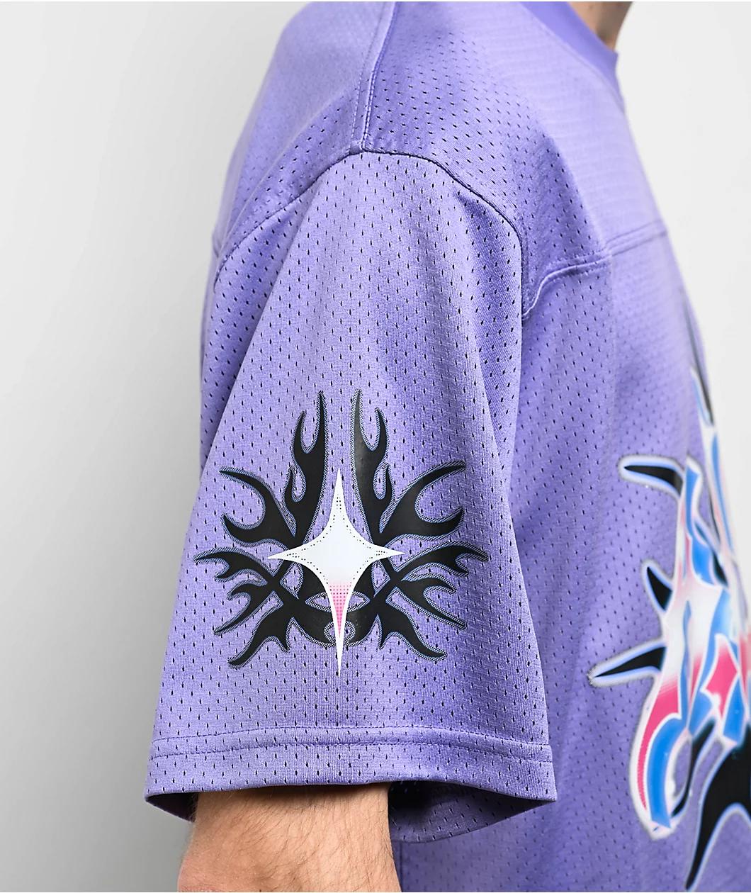 Add a sporty vibe to any outfit with the Cracked mesh jersey from A.LAB, landing in an eye-catching shade of purple. Pink, blue, white, and black branding decorates the front for bold pop, with a matching graphic on the right sleeve finishing the Y2K