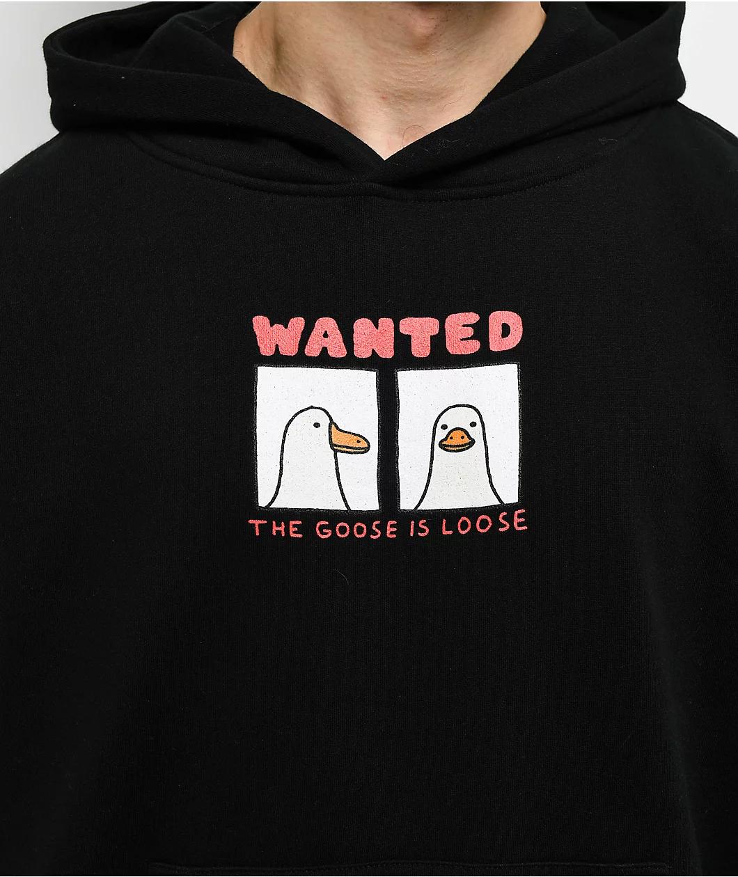 The Goose Is Loose hoodie comes from the minds at A.LAB in a solid black cotton blend with a humorous graphic printed on the front. Showing an illustrated mugshot of a white Goose beneath the capitalized word "Wanted", the warm sweatshirt features an