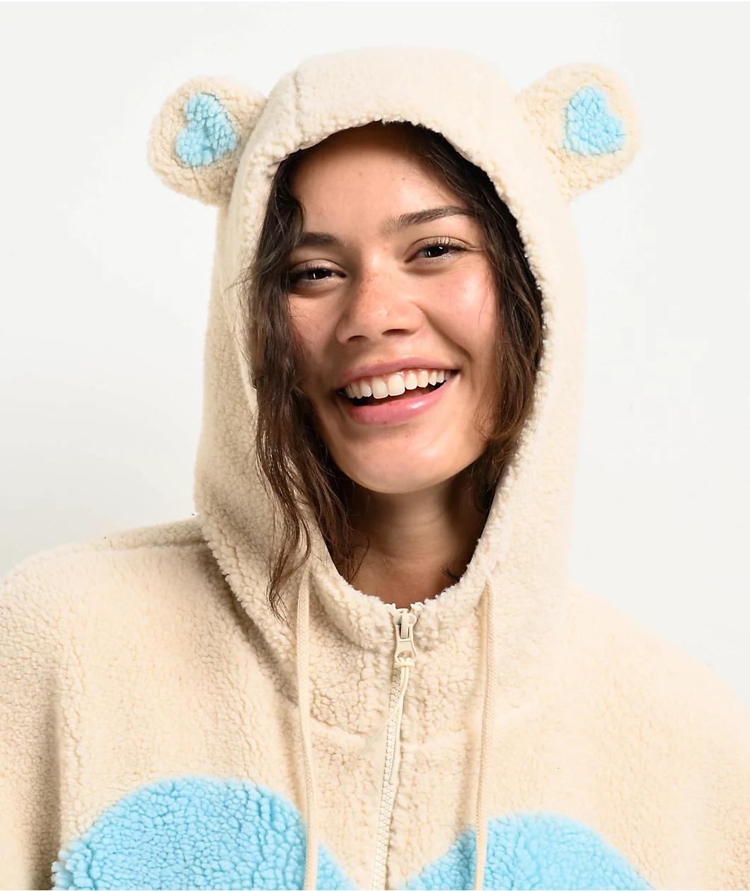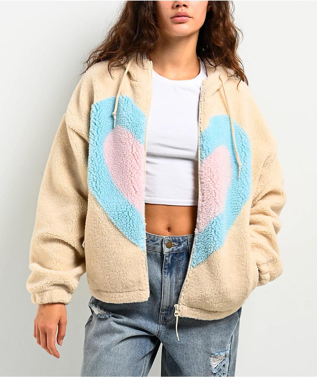 Delivered by A.LAB in a white polyester build with "Blurple" bluish-purple jacquard-knit accents, the Lydia Teddy Heart hoodie features a full zip closure and a fuzzy sherpa construction for noticeable warmth. The front of the textured zip down sweat
