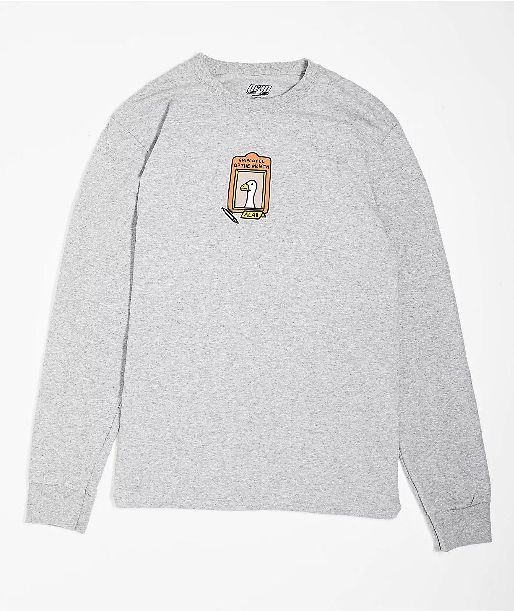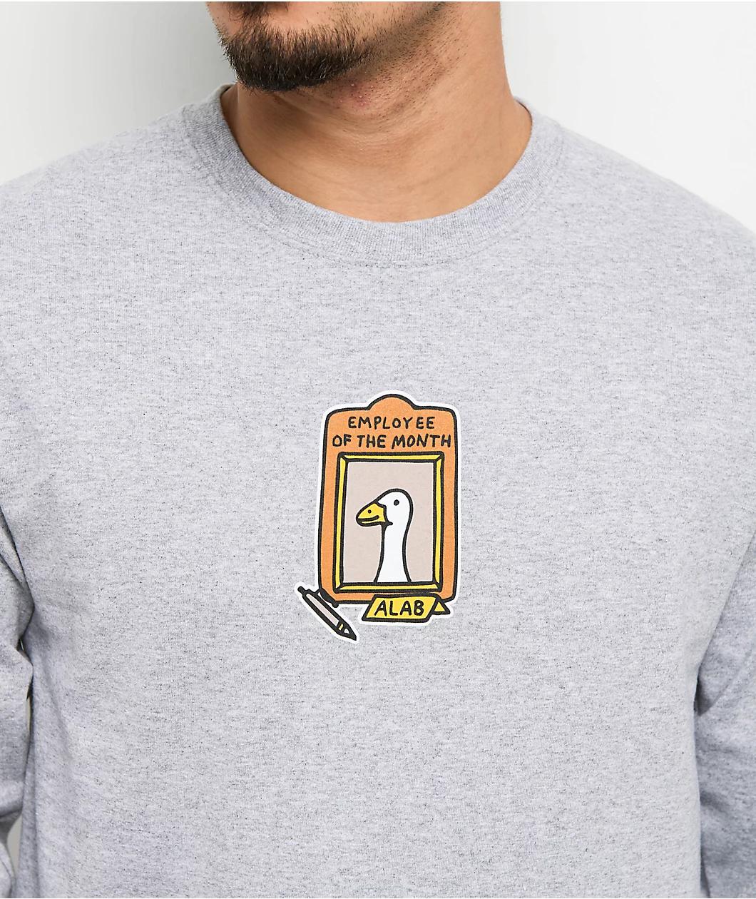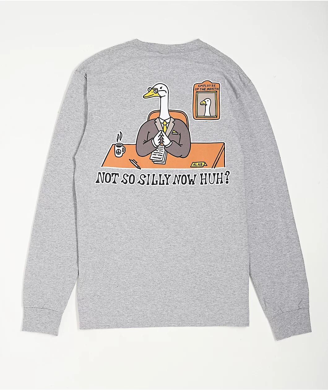 Landing in a long sleeve silhouette, A.LAB introduces the Not So Silly t-shirt in a grey cotton construction. Sporting a printed cartoon graphic on the chest and on the back, the front of the long sleeve shows a framed picture of a goose with "Emplo