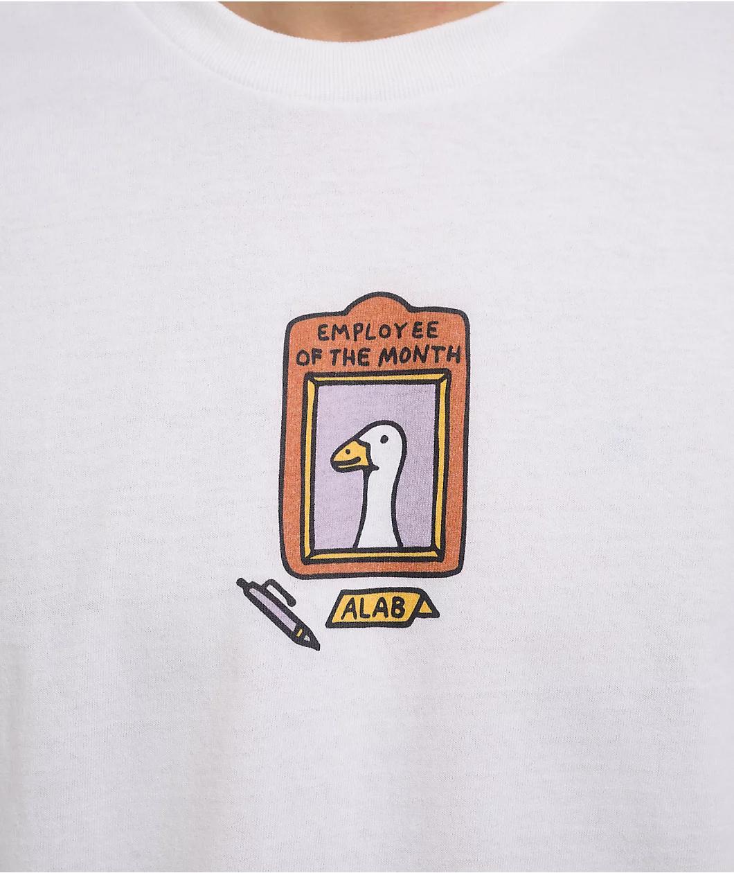 Prove that you can rise above your nature with the white Not So Silly t-shirt from A.LAB. Art on the back of a business-ready goose in front of a picture of itself in an employee of the month frame sits above text reading "Not So Silly now huh?", pro