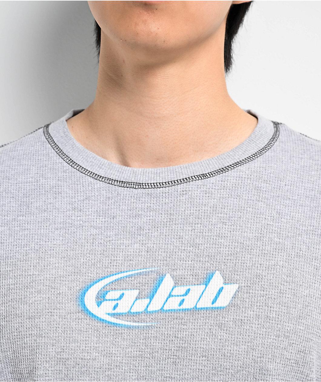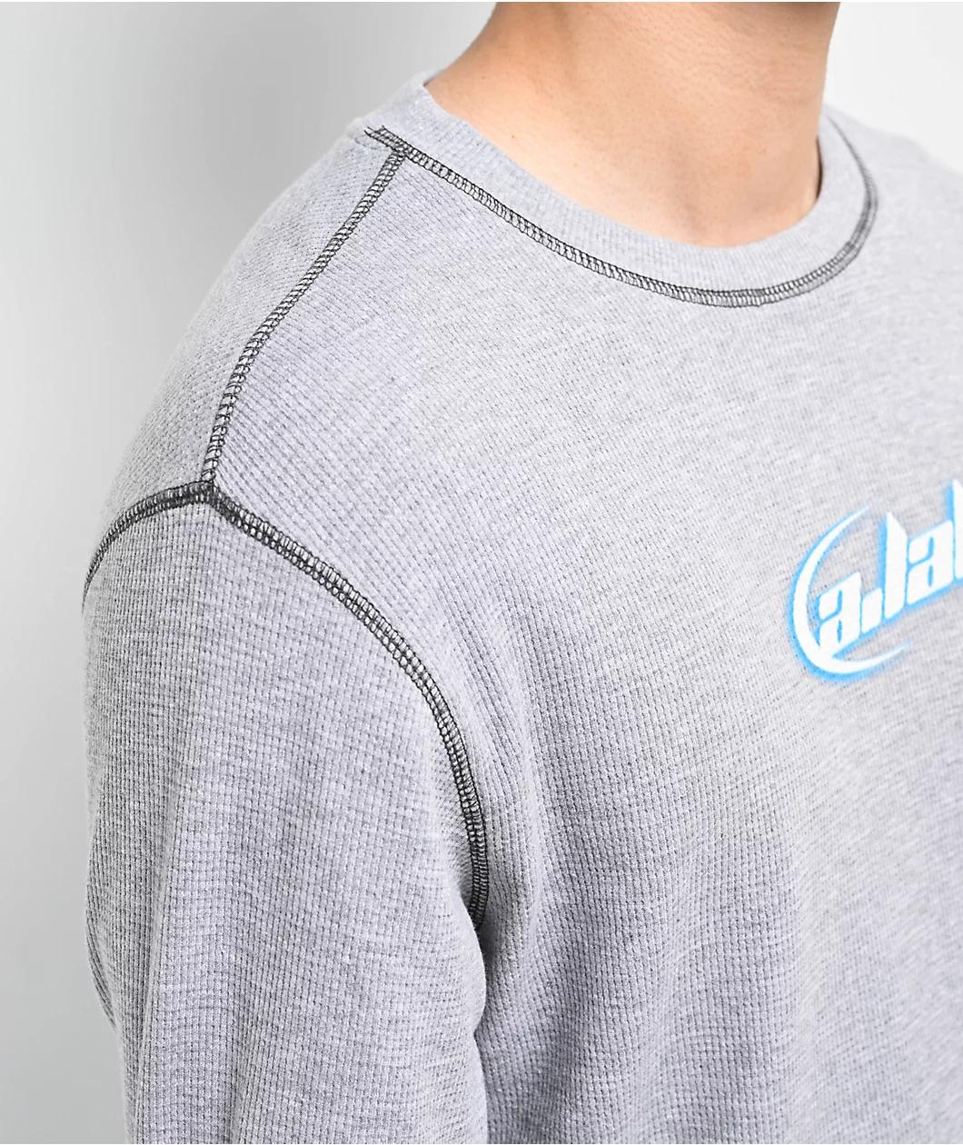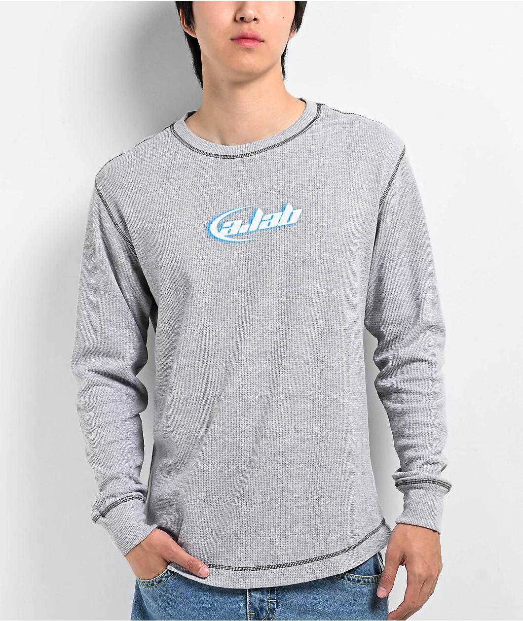 Landing in a grey colorway, A.LAB welcomes the Saturn thermal long-sleeve t-shirt with Y2K-inspired screen-printed graphics across the chest. The image depicts "A.LAB" in a retro space font with blue accents and a subtle half-ring around the letters.