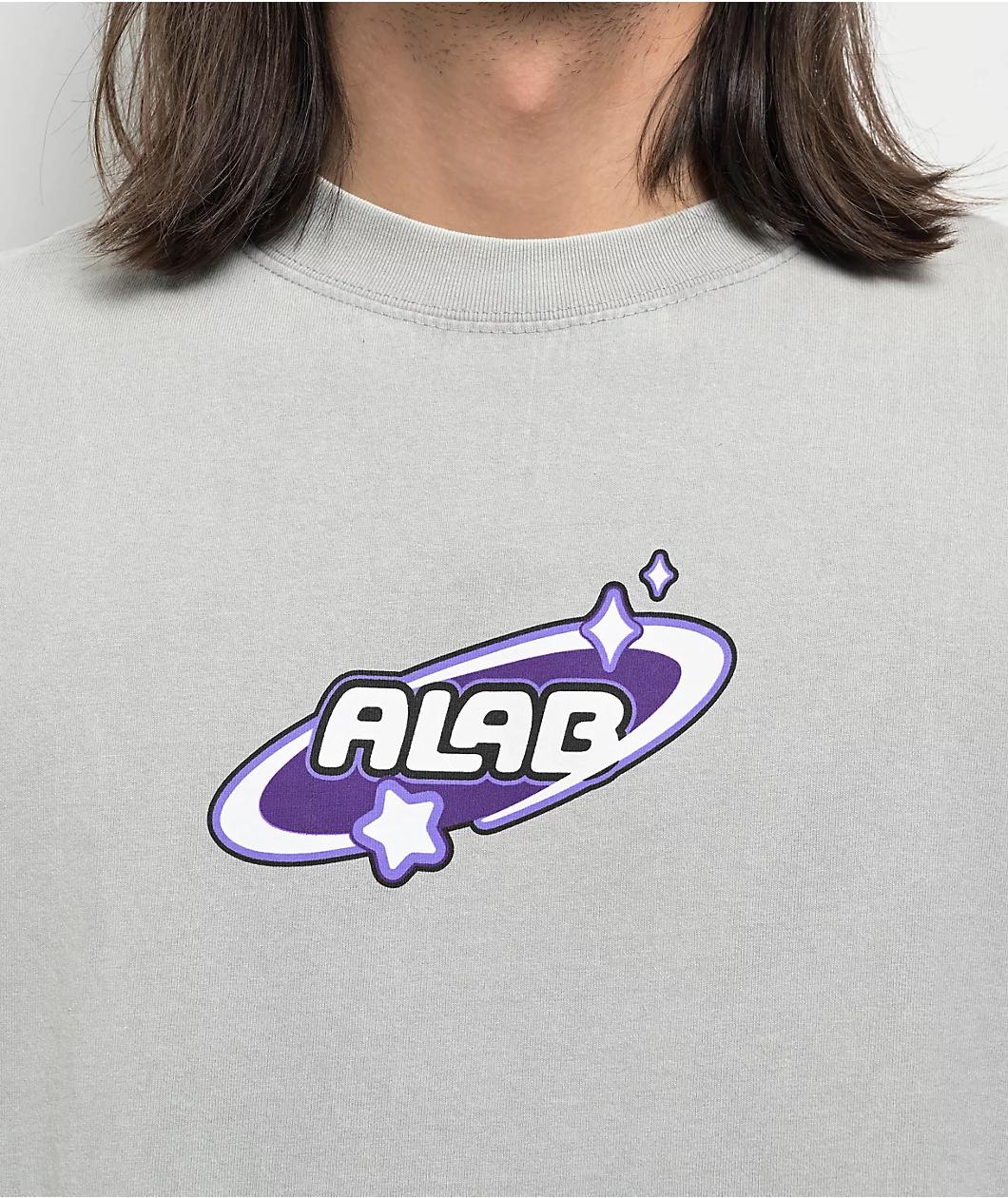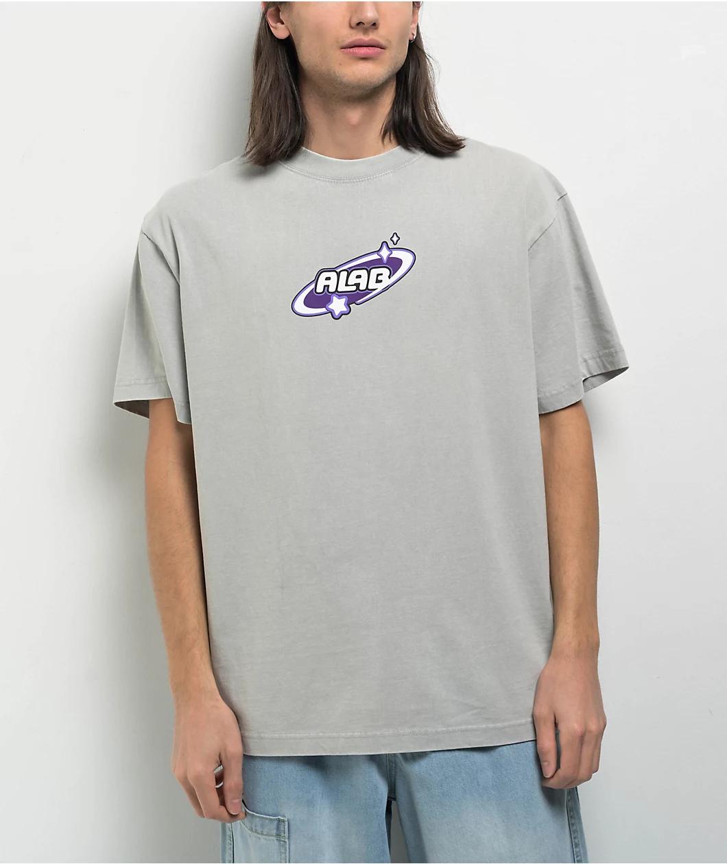 Add a spacey Y2K touch to any outfit with the grey Spacedude t-shirt from A.LAB. The tee features white and purple branding on the chest, complimenting a cute purple alien on the back. Text below the alien and additional branding in a futuristic font