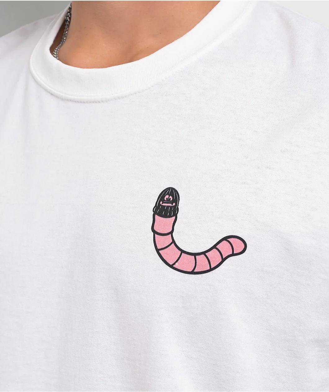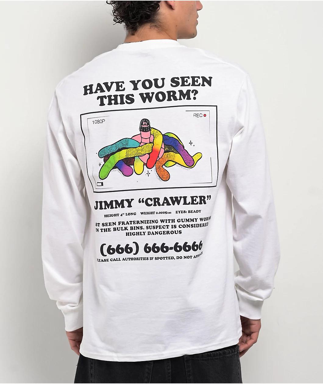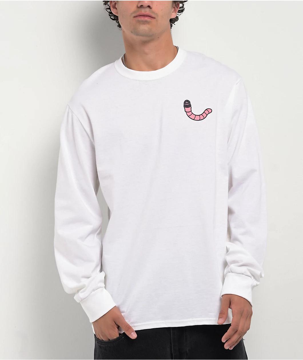 Landing in a clean white cotton build from A.LAB, the Who Is He long sleeve t-shirt displays fun printed graphics on the left chest and back. Sporting a cartoon image of a worm in a ski-mask on the front, the back of the casual tee borrows a wanted p