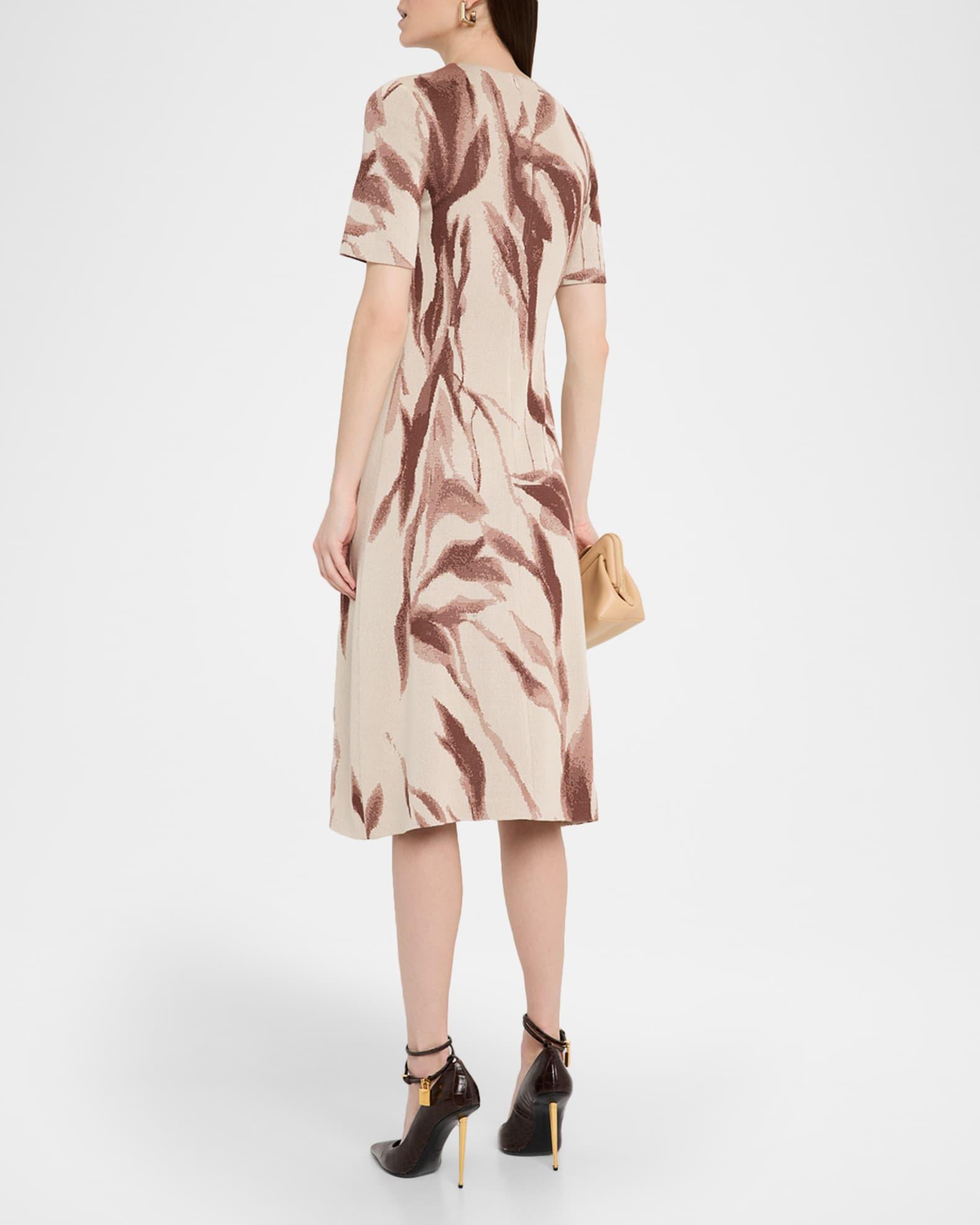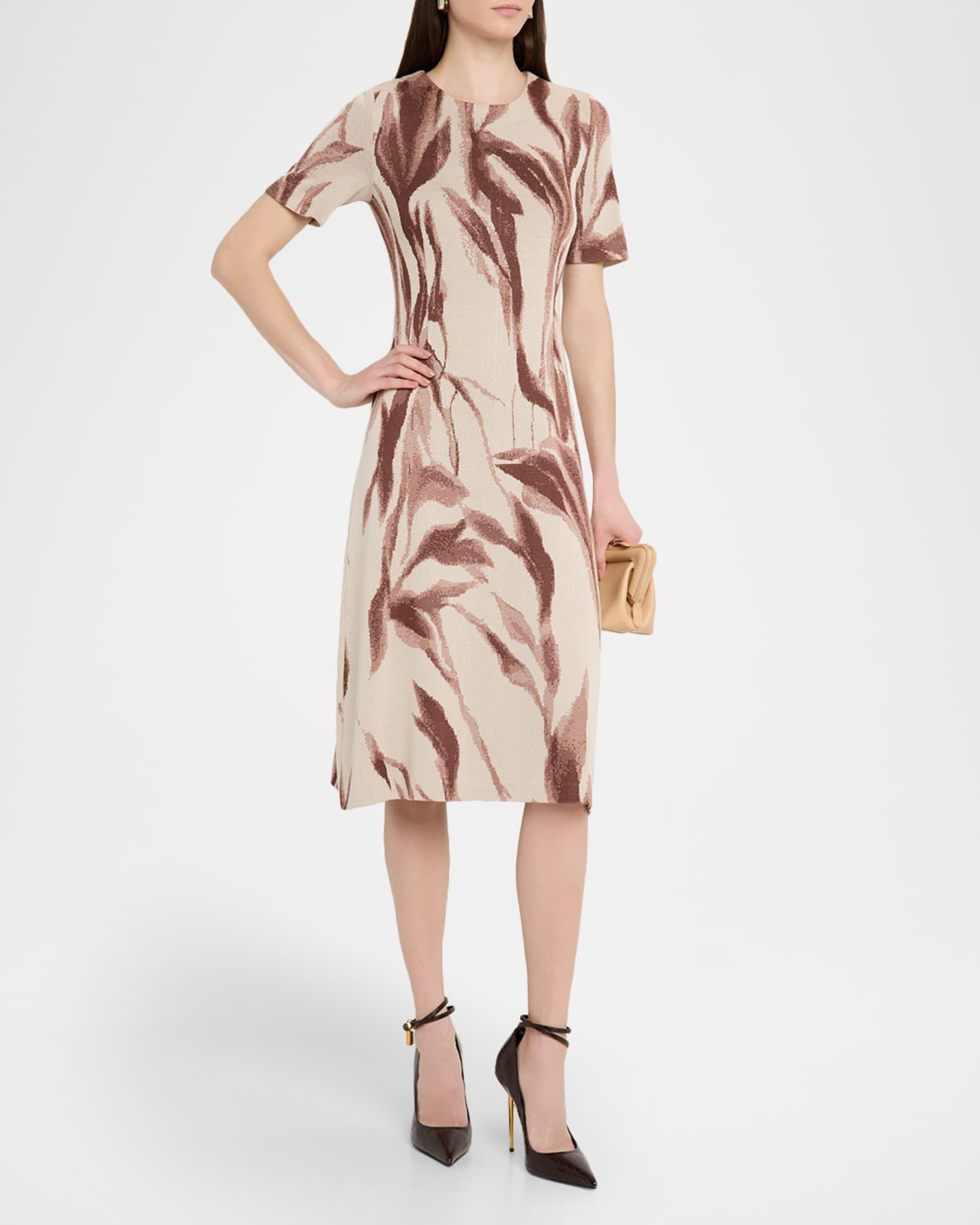 Misook midi dress crafted in a soft botanical jacquard knit Approx. 45"L from shoulders to hem Jewel neckline Short sleeves Hem falls below the knee A-line silhouette Invisible back zipper Rayon/cellulose acetate/polyester Machine wash Imported
