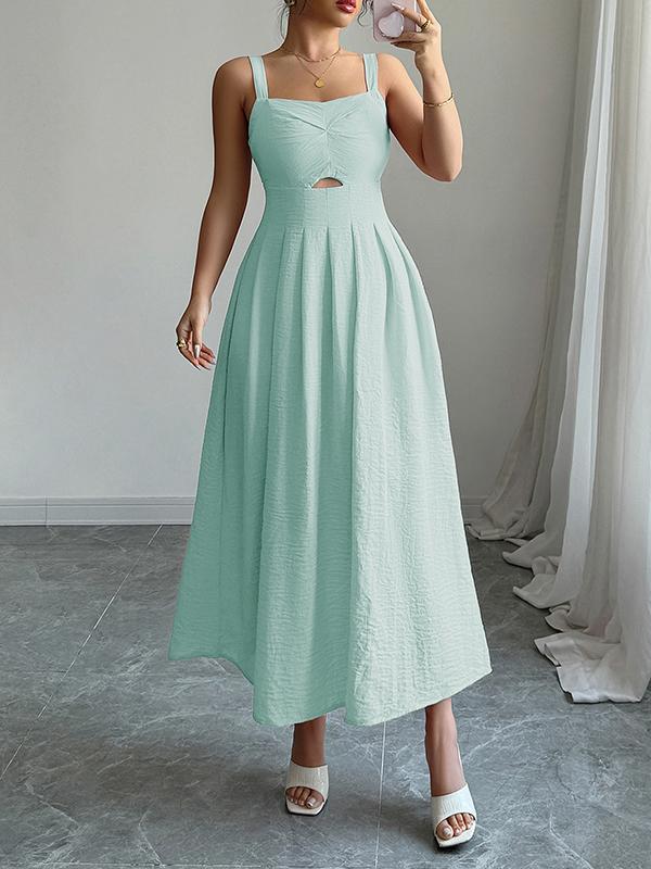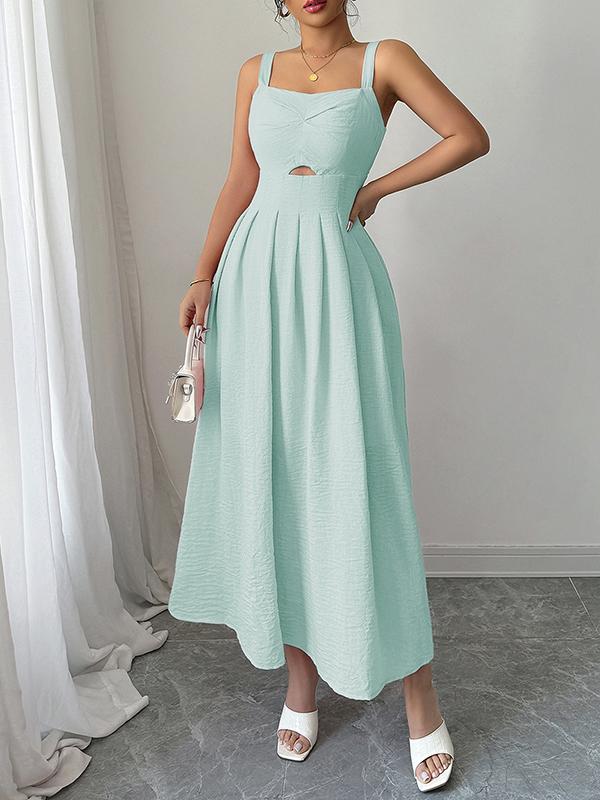 SkuCY-!183034Material95% Polyester StyleLoose , A-line , Sleeveless , High Waisted FeaturePleated , Hollow , Backless , Solid Color , Zipper NecklineSpaghetti-neck OccasionCasual , Leisure Fashion SeasonsSpring , Summer TypeMidi Dresses ColorPINK,BLUE,GREEN,APRICOTSizeS,M,L,XL Please consult the size chart we provide for this item's measurements to help you decide which size to buy.Please note: There may be 1-3cm differ due to manual measurement.CMINCHBustWaistLengthS8170115M8574116L8978117XL9382118