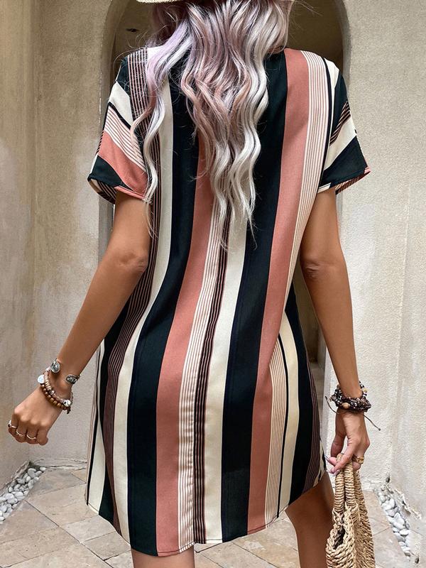 Step out in style with our elegant A-line high-waisted mini dress. Crafted with a flattering A-line silhouette and a high-waisted design, this dress accentuates your figure while providing comfort and ease of movement. The V-neckline adds a touch of sophistication, perfect for both casual outings and semi-formal occasions. The striped pattern adds a chic and timeless appeal, making it a versatile piece for your wardrobe. Pair it with your favorite accessories and heels for a polished look that's sure to turn heads.