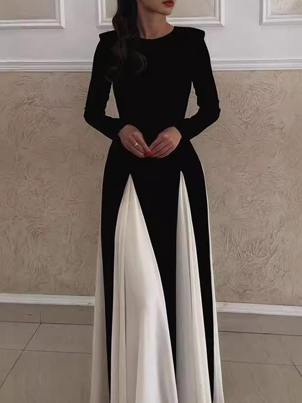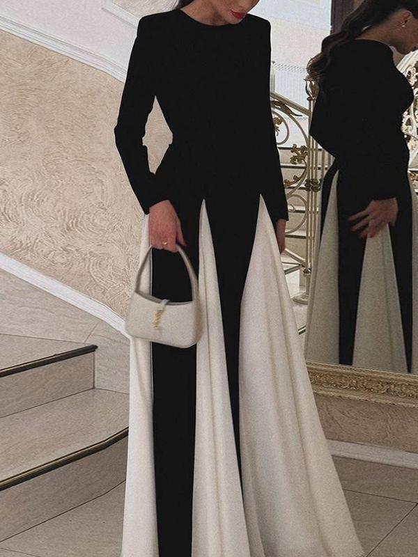 Step into elegance with our A-Line Long Sleeves Contrast Color Elasticity Pleated Split-Joint Round-Neck Evening Maxi Dress. Featuring flattering pleats, a contrast color design, and a comfortable elastic fit, this dress is perfect for formal events. Shop now for stunning evening wear with fast delivery!