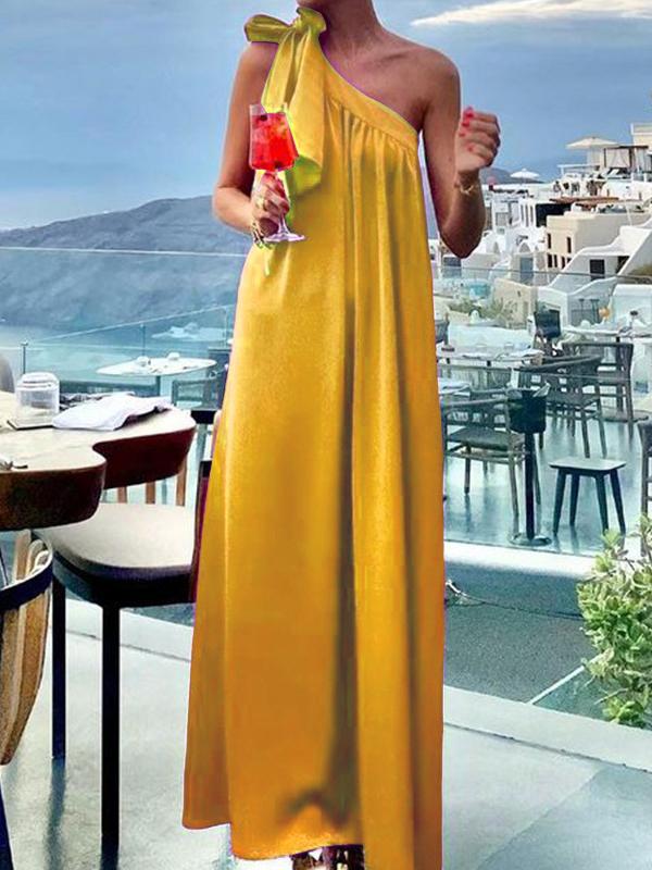 A-Line Loose Asymmetric Pleated Solid Color Tied One-Shoulder Maxi Dresses