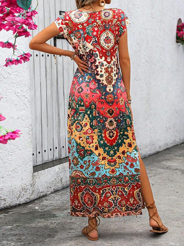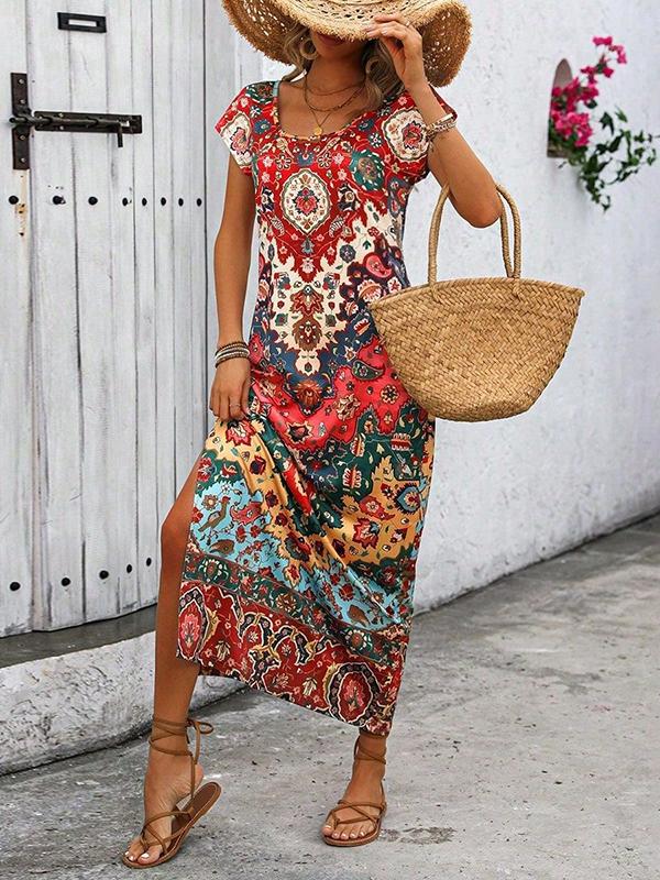 A-Line Loose Contrast Color Flower Print Split-Side U-Neck Maxi Dresses
