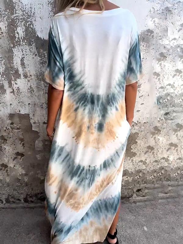 Embrace bohemian vibes in this A-line maxi dress, featuring a loose fit, vibrant tie-dyed pattern, and stylish contrast color pockets. The V-neckline adds a touch of femininity to this effortlessly chic ensemble.