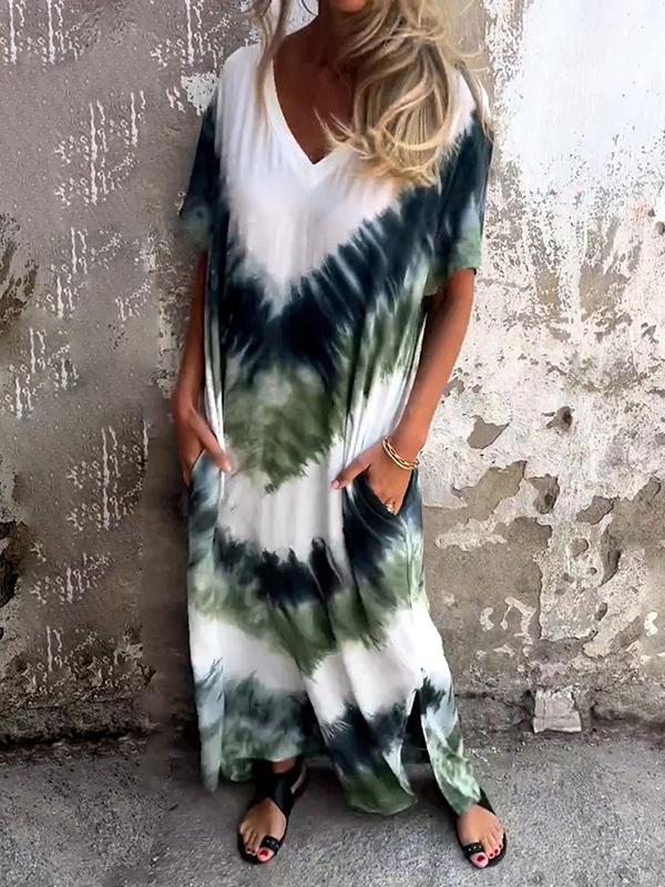 A-Line Loose Contrast Color Pockets Tie-Dyed V-Neck Maxi Dresses
