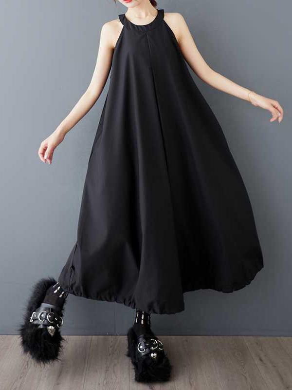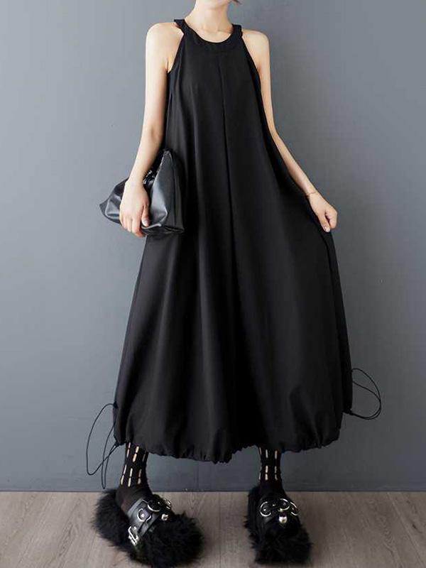 A-Line Loose Drawstring Pleated Pockets Solid Color Zipper Spaghetti-Neck Midi Dresses