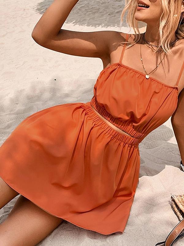 Discover modern elegance with our A-line mini dress, featuring a loose fit, elastic hollow design, and solid color. The split-joint construction and spaghetti straps add a stylish touch, making it perfect for both casual and special occasions.