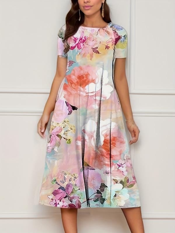 A-Line Loose Flower Print Pockets Round-Neck Midi Dresses