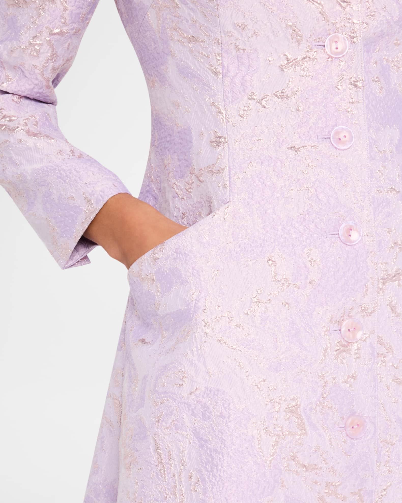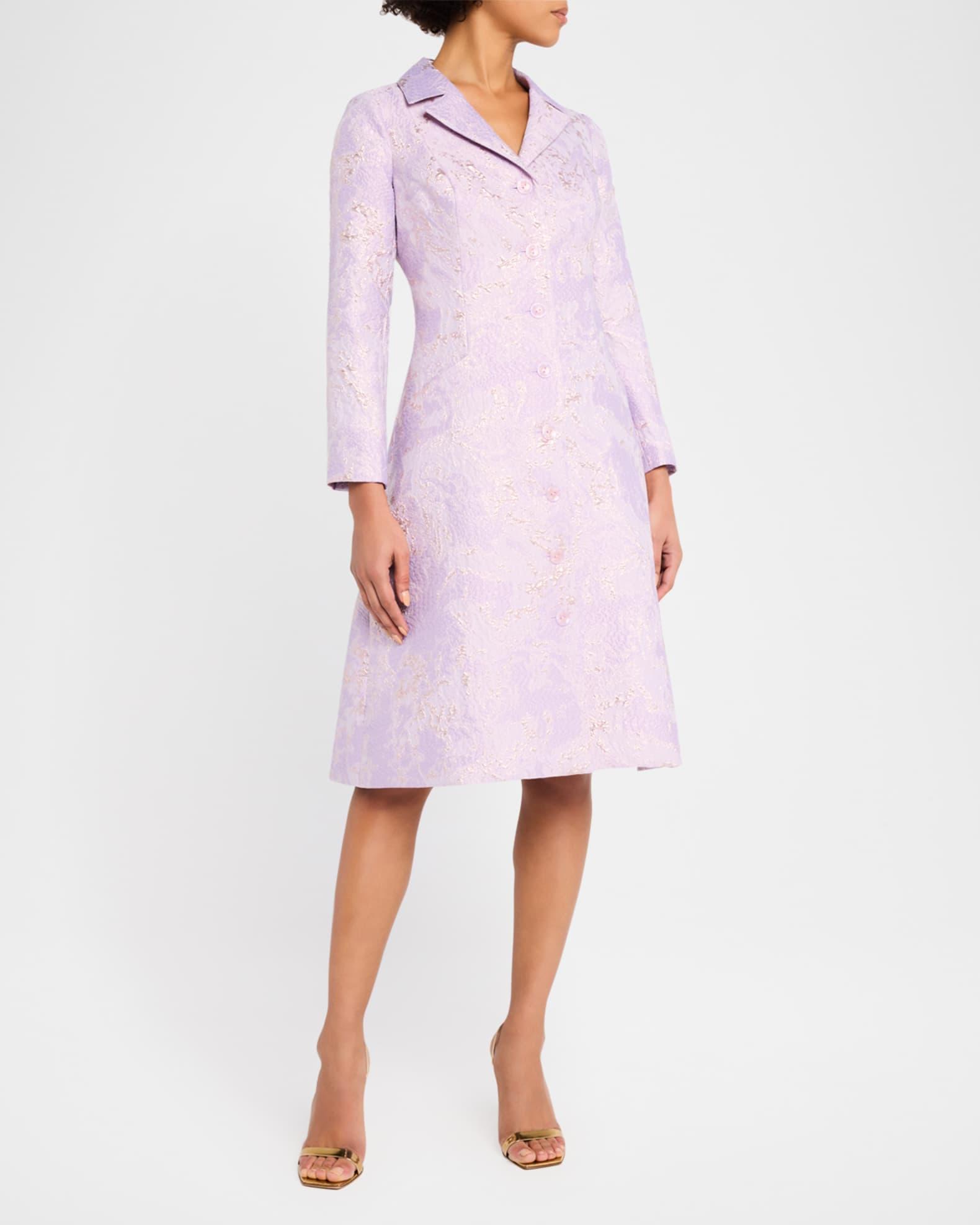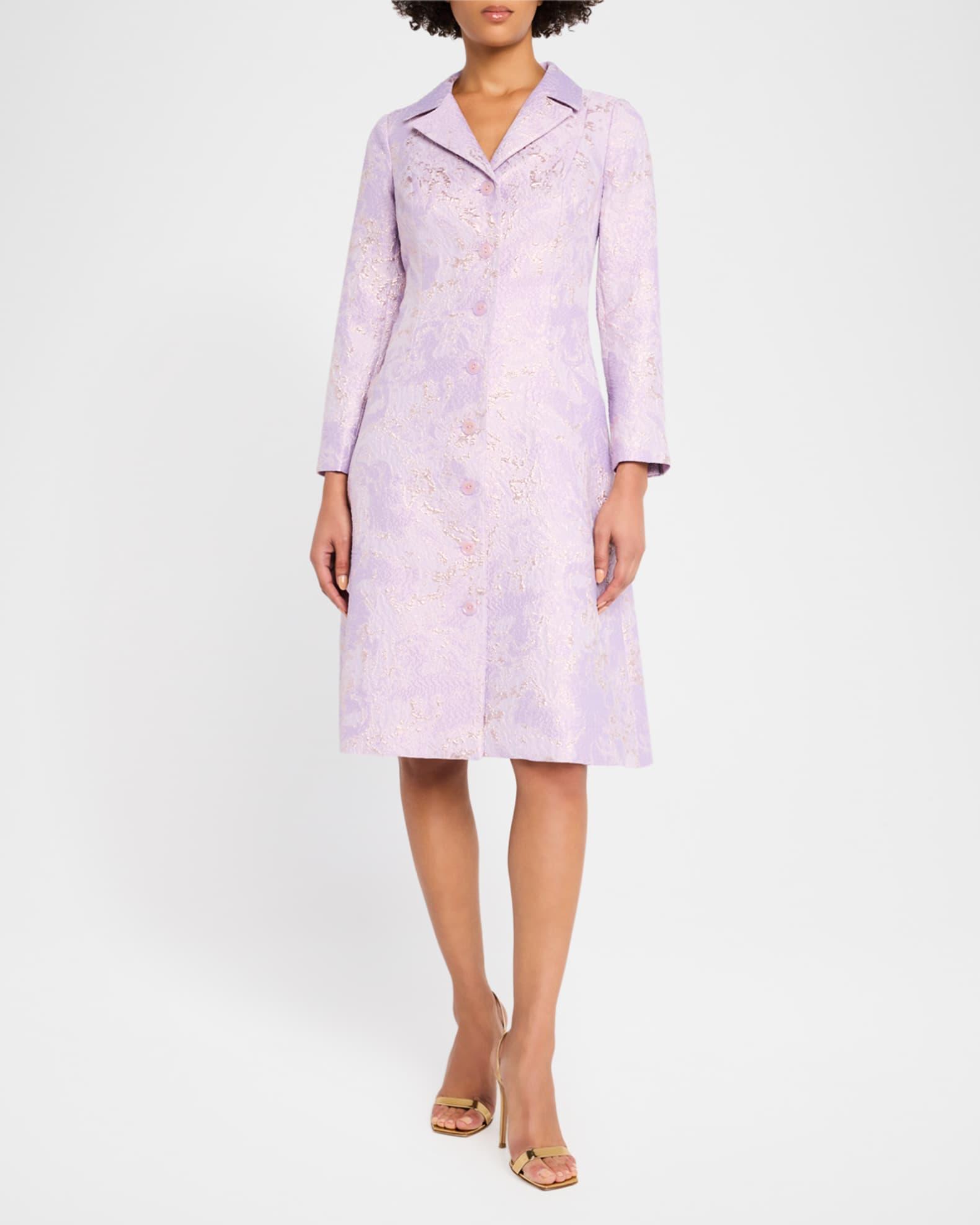 Rickie Freeman for Teri Jon coat dress in metallic jacquard Approx. 42"L from shoulders to hem Notched lapel; button front Bracelet sleeves Button cuffs Side slant pockets Hem hits around the knee A-line silhouette Polyester/metallic fibers Imported