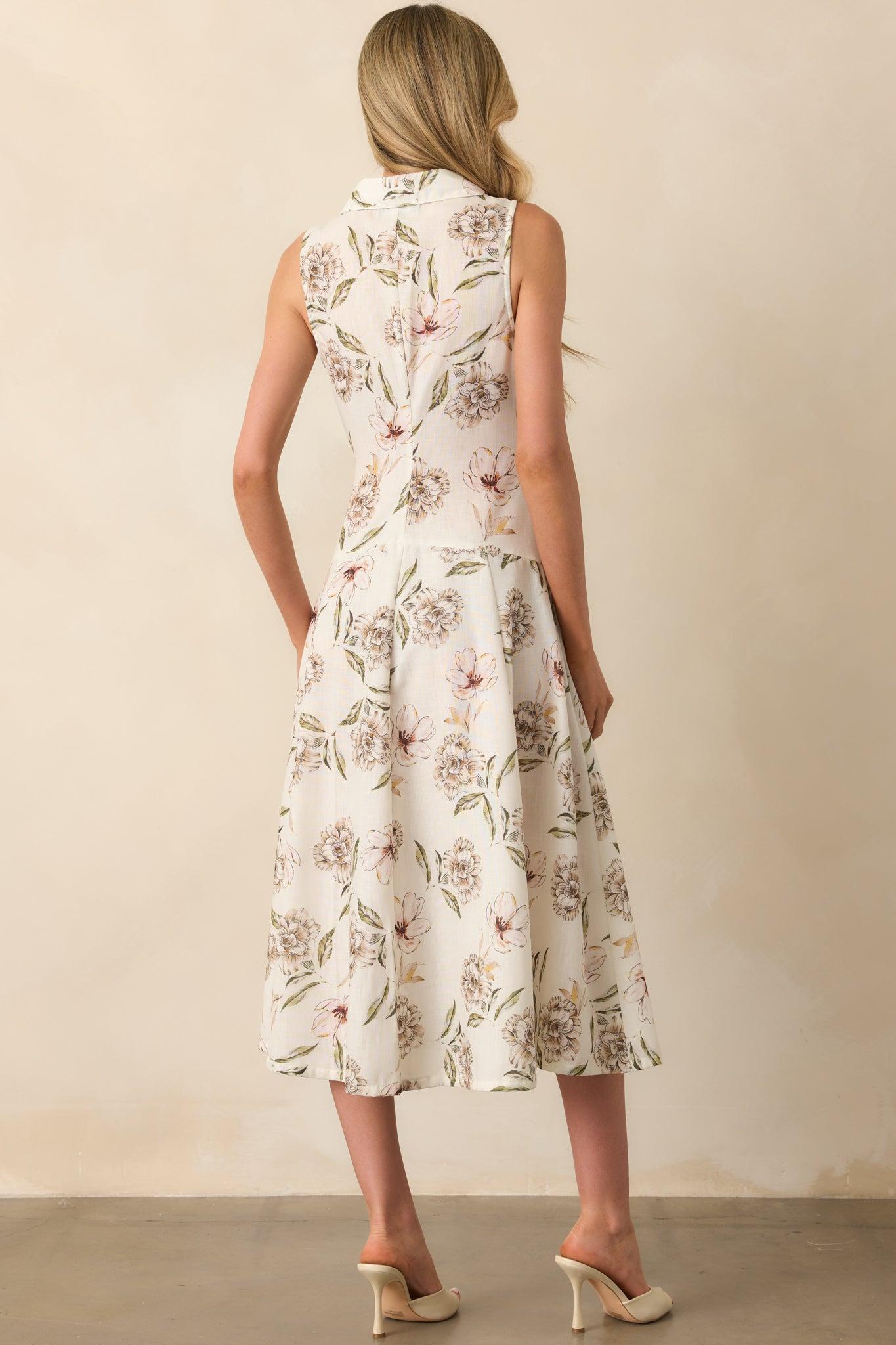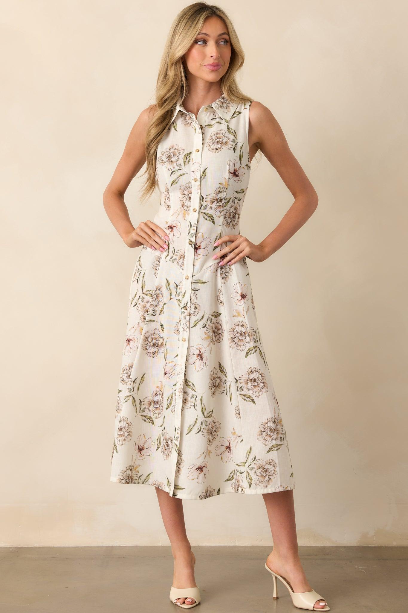 Our A Little Grace Goes A Long Way Ivory Multi Floral Print Midi Dress is made for moments when you want your look to feel effortlessly refined. With a soft, feminine touch, it’s a lovely option for daytime events, brunches, or quiet afternoons spent somewhere special. This ivory midi dress features a green multicolor floral print, collared neckline, functional button front, sleeveless design, and a drop waist silhouette. 100% Polyester Unlined Hand Wash Cold Manufactured in China Designed in The USA Model is Wearing a Size Small