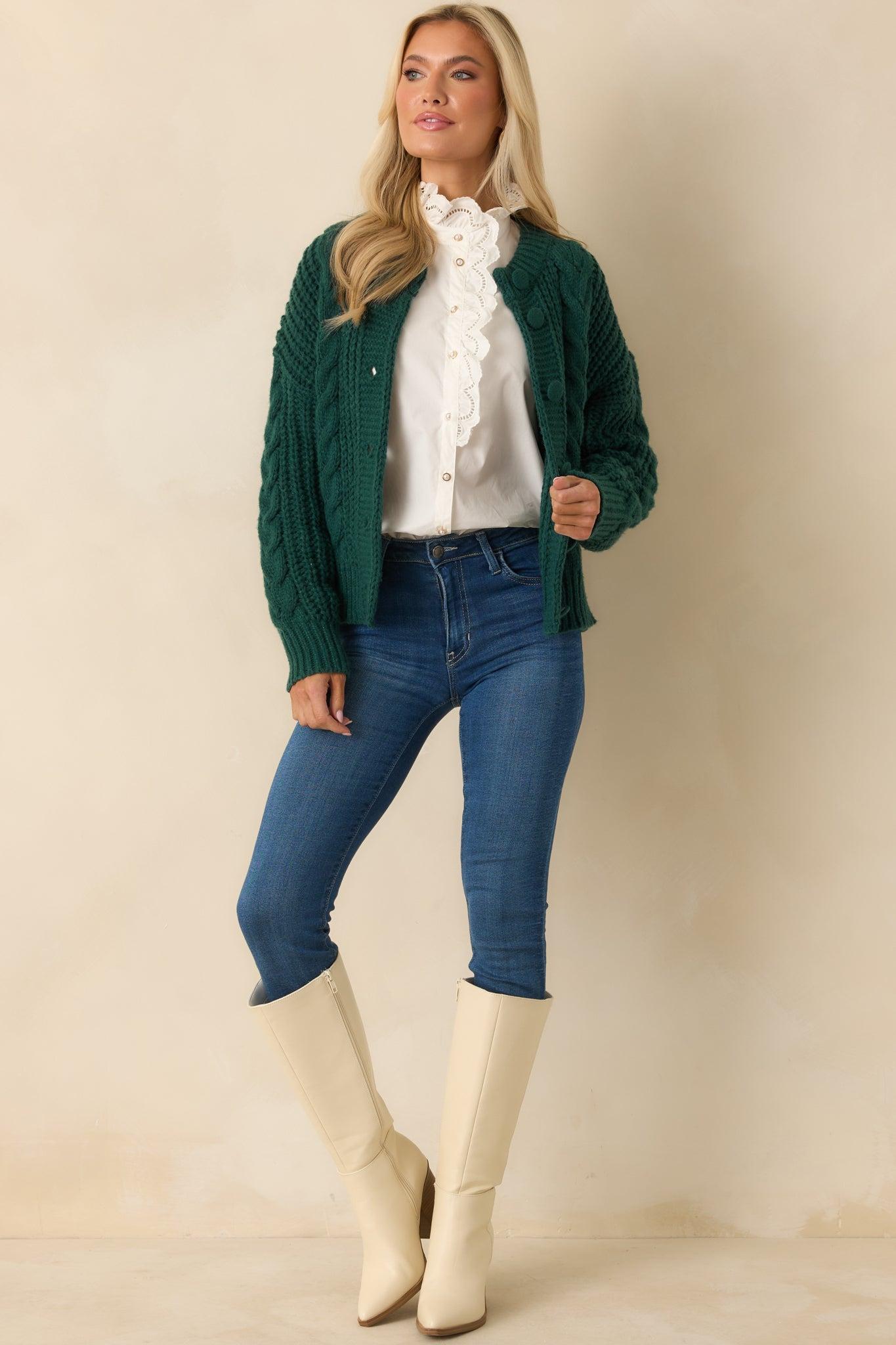 The A Look That Lasts Forest Green Cable Knit Button Up Cardigan is the kind of layer you’ll hold onto, easy to wear and always ready to come back around. This forest green cardigan features a chunky cable knit design, ribbed hems, a crew neckline, drop shoulders, long sleeves, functional button front, covered knit buttons, and a relaxed fit. 100% Polyester Unlined Hand Wash Cold Manufactured in China Designed in The USA Model is 5'8" and Wearing a Size Small