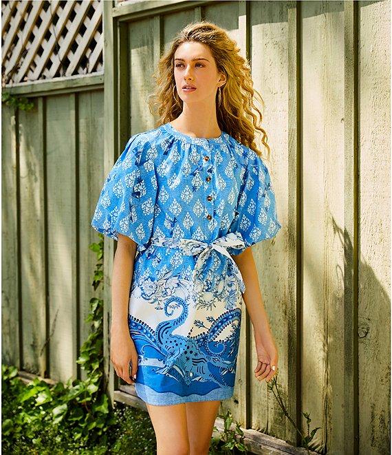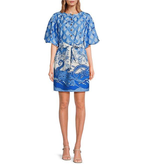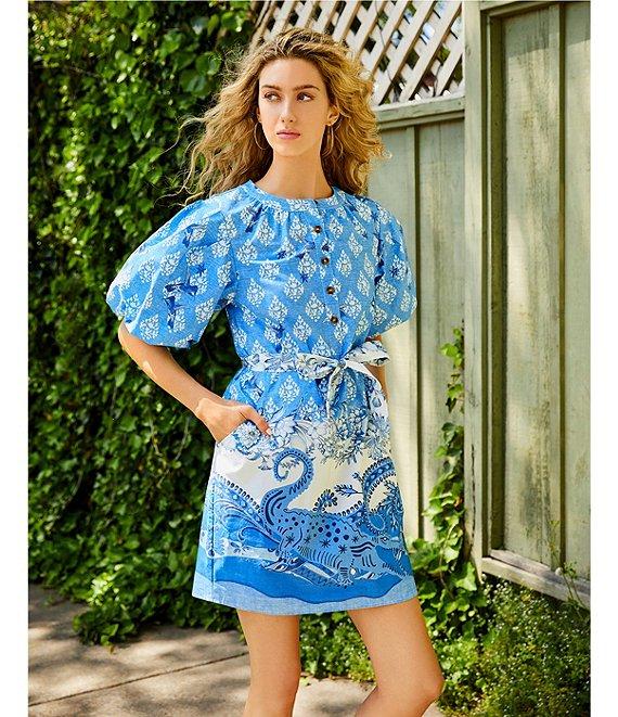 From A loves A, this dress features: Woven fabrication Placement print details at borders Scenic animal graphic print at hemline Mandarin collar Partial button front closure Pull-on construction Short bubble sleeve Self tie at waistline Sheath silhouette Classic fit Functional side pockets Straight hemline Mini length Approx. 36" HPS in length Cotton Turn garment inside out prior to wash, machine wash on delicate cold cycle only, wash with similar colors and fabrications, promptly remove from wash, tumble dry on low, promptly remove from dryer, use warm steam iron if needed. Imported. Dillard's Exclusive