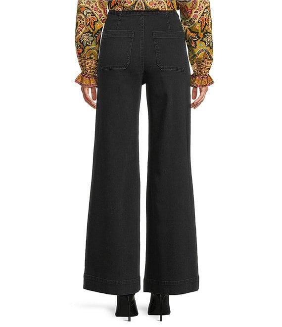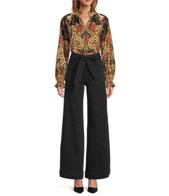 From A Loves A, these jeans feature: Denim fabrication High rise waistline Self tie belt Front button with zipper closure Functional front quarter top pockets Functional back patch pockets Wide straight leg silhouette Modern fit Straight hemline Full length Approx. 31.5" Inseam Cotton, polyester, spandex Machine wash on cold cycle, wash with similar colors and fabrications, tumble dry on low, promptly remove from dyer, use warm steam iron if needed. Imported. Dillard's Exclusive