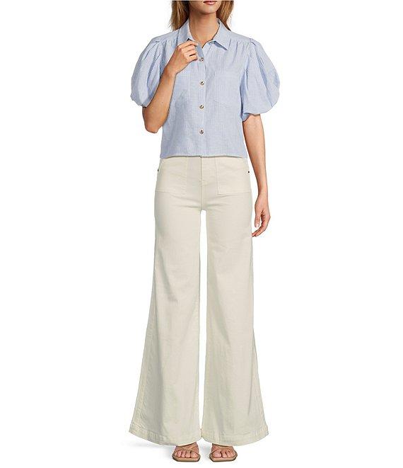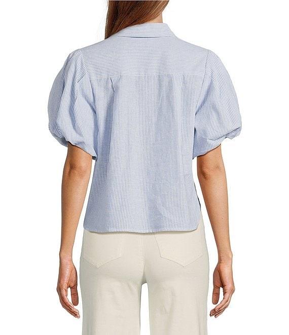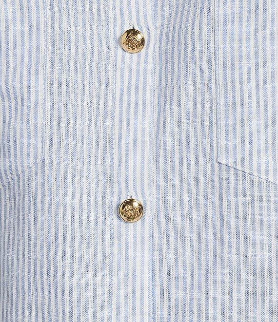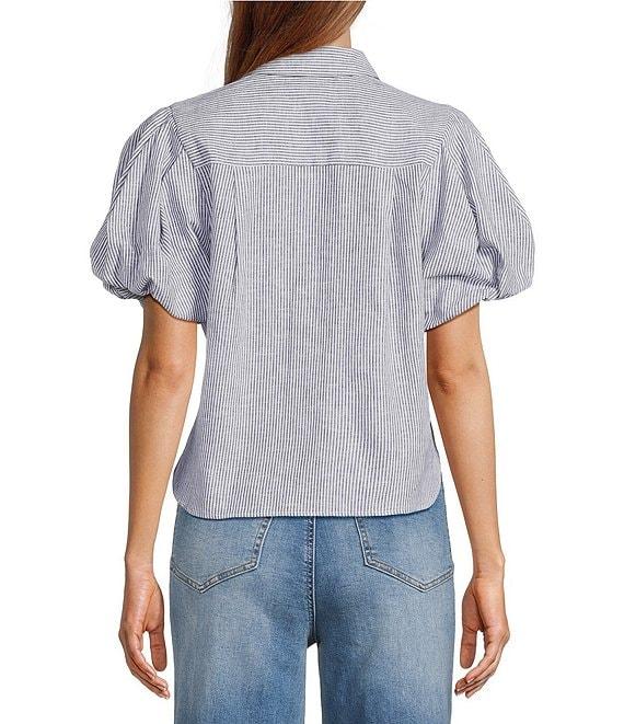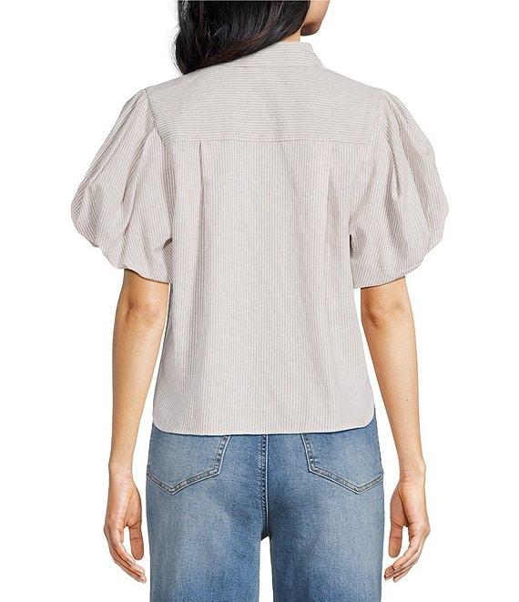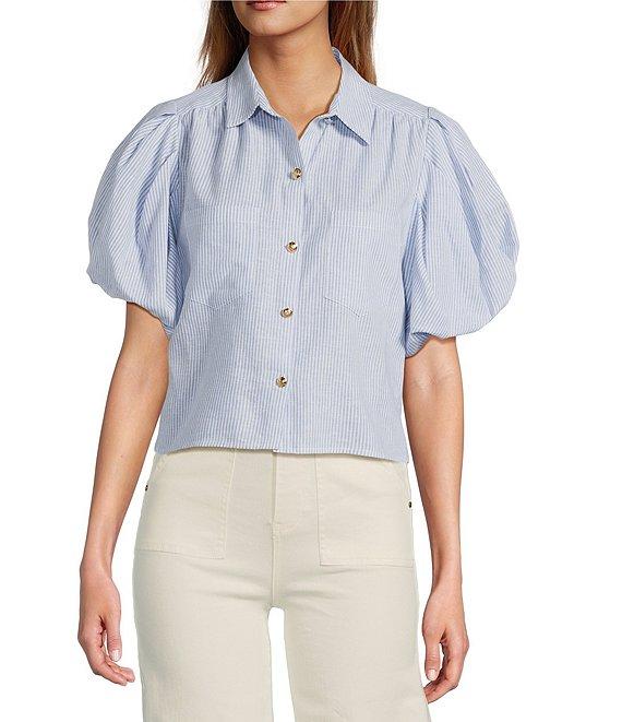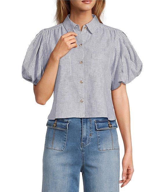 From A Loves A, this shirt features: Linen Fabrication Yarn Dye Stripe Print Point Collar Neckline Embellished Button Front Closure Double Chest Pockets Ruched Short Bubble Sleeve Button Down Silhouette Center Back Yoke Modern Fit Straight Hemline Average Length Approx. 20" HPS in Length Linen, Cotton Machine wash on cool gentle cycle, wash with similar colors and fabrications, promptly remove from wash, hang on line to dry, use steam iron on low as needed. Imported. Dillard's Exclusive.