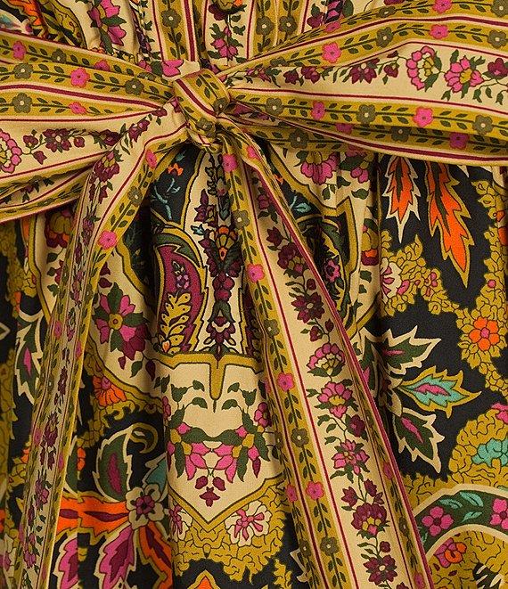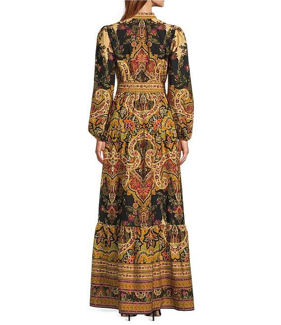 From A Love A, this dress features: Woven fabrication Paisley print Mandarin collar V-neckline Long balloon sleeve Elastic cuff Pullover construction Center back zipper with hook & eye closure Front self tie belt A-line silhouette Tiered dress skirt Fully lined Flounce hemline Maxi length Approx. 58.5" length Cotton Machine wash on cold cycle, wash with similar colors and fabrications, tumble dry on low, use warm steam iron if needed. Imported. Dillard's Exclusive