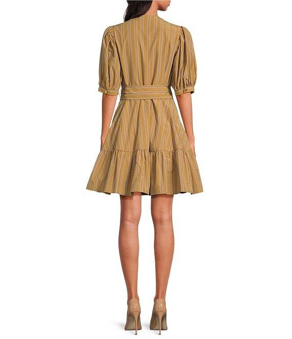 From A Loves A, this dress features: Woven fabrication Pinstripe print Crew neckline Button front closure Self tie at waist belt A-line silhouette Classic fit Fully lined Flounce hemline Mini length Approx. 37" length Self: Lyocell, cotton Lining: Cotton Machine wash on cold cycle, wash with similar colors and fabrications, promptly remove from wash, hang on ling to dry, use warm steam iron if needed. Imported. Dillard's Exclusive