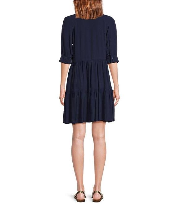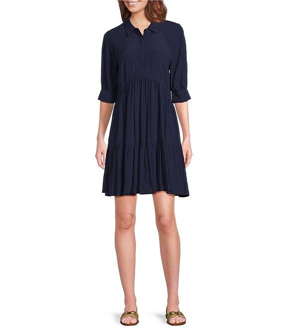 From A Loves A, this shirt dress features:Woven fabricationShirt dress silhouettePoint collar neckline3/4 sleeves with button cuffsTiered skirt LinedStraight hemlineButton front closureApprox. 36.5" in lengthViscoseMachine wash; line dryImported.