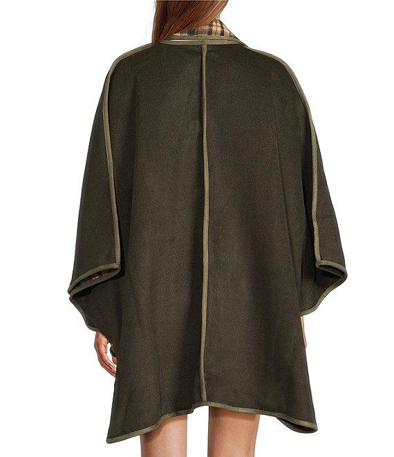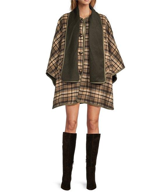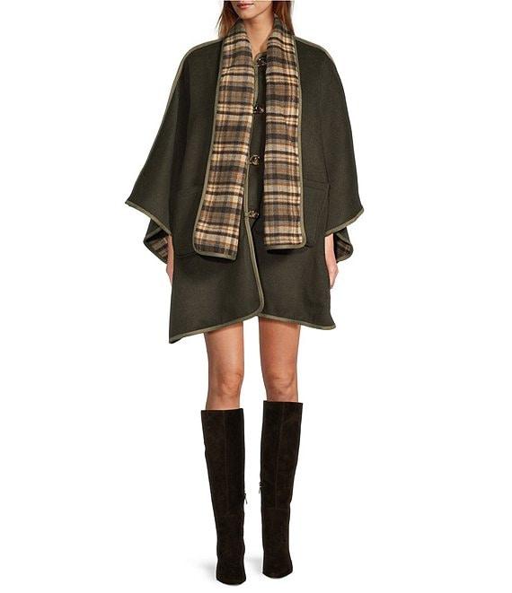 From A Loves A, this cape & scarf set features: Cape Wool blend fabrication Reversible Solid one side Plaid print one side Contrast trim Crew neckline Long drape sleeves Button & loop front closure Cape silhouette 2 Functional patch pockets Flounce hemline Long length Approx. 34.5" length Polyester/acrylic/nylon/wool/rayon Professional dry cleaning Scarf Wool blend Reversible Solid one side Plaid print one side Contrast trim Scarf silhouette Approx. 8/14" in width Approx. 66" in length Polyester/acrylic/nylon/wool/rayon Professional dry cleaning Imported. Dillard's Exclusive