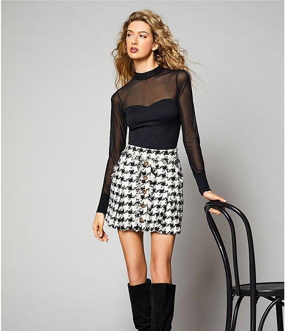 From A Loves A, this top features: Sheer illusion mesh fabrication Solid knit fabrication Sheer mock neckline Sheer long sleeve Solid tall cuff Solid knit sweetheart bodice Low scoop backline Fitted silhouette Straight hemline Average length Approx. 26.5" HPS in length Nylon, spandex Turn garment inside out and place into a garment bag prior to wash, wash in cold gentle cycle, wash with similar colors and fabrications, tumble dry on cool, use steam iron if needed. Imported. Dillard's Exclusive